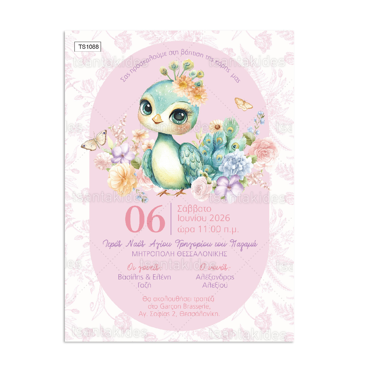 Προσκλητήριο βάπτισης για κορίτσι με θέμα Cute Peacock.