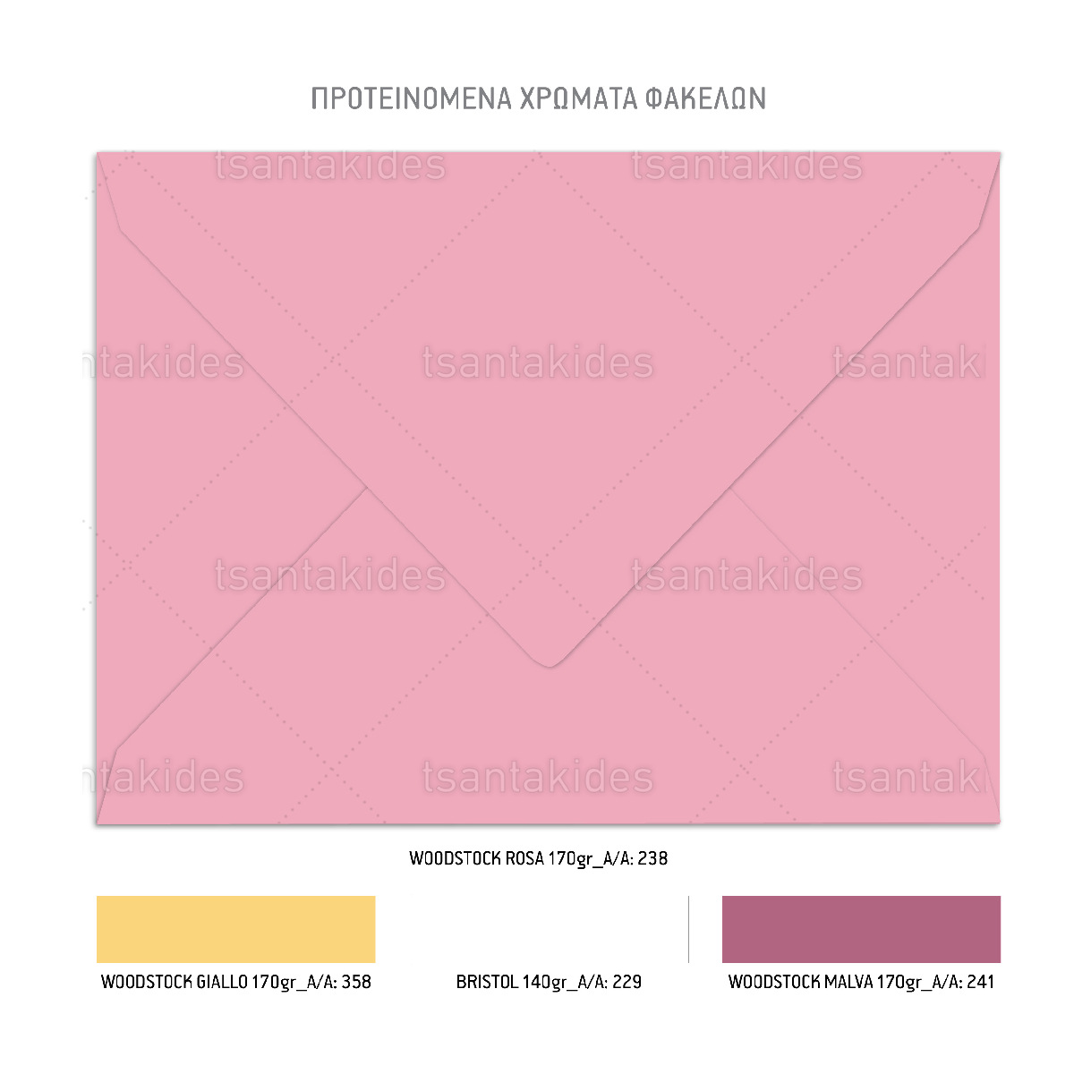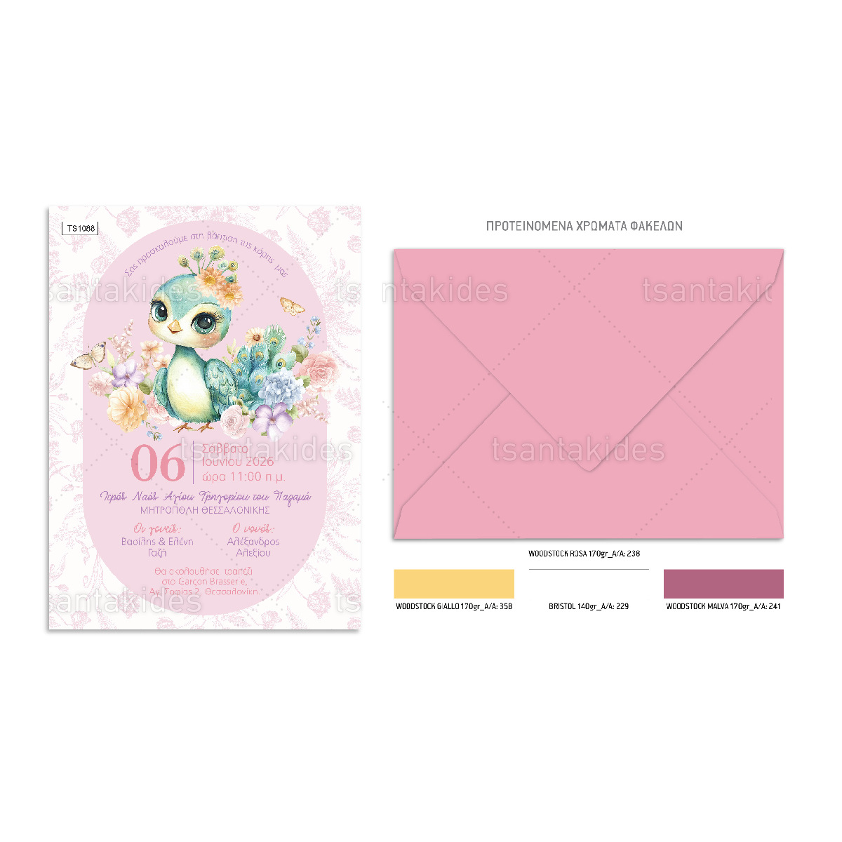 Η κάρτα του προσκλητηρίου είναι τυπωμένη σε λευκό ματ χαρτί 250 γρ. Το προσκλητήριο διαθέτει φάκελο διάστασης 19,5 x 14,5 εκ. σε χαρτί της επιλογής σας από τους αναγραφόμενους κωδικούς.