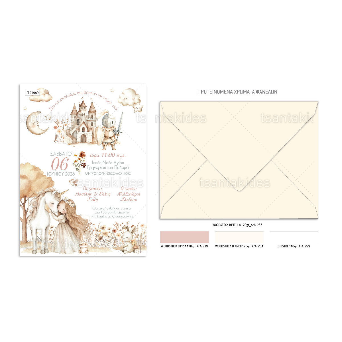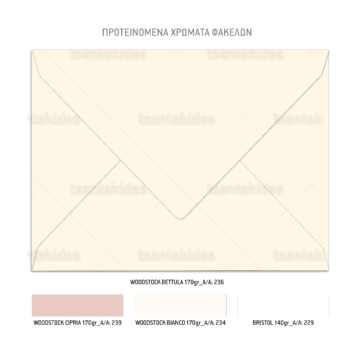 Η κάρτα του προσκλητηρίου είναι τυπωμένη σε λευκό ματ χαρτί 250 γρ. Το προσκλητήριο διαθέτει φάκελο διάστασης 19,5 x 14,5 εκ. σε χαρτί της επιλογής σας από τους αναγραφόμενους κωδικούς.