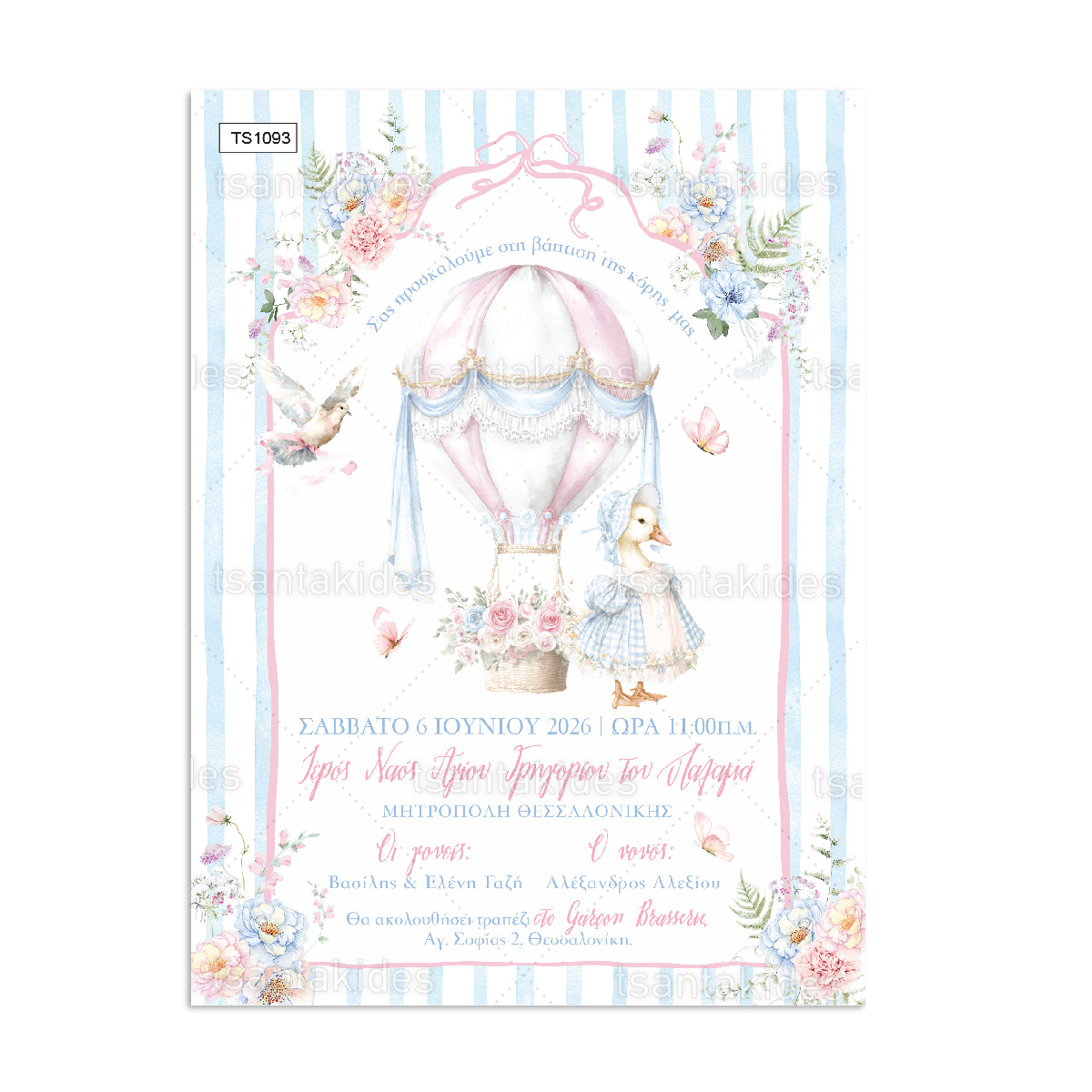Προσκλητήριο Βάπτισης Για Κορίτσι Rose Hot Air Balloon 1093