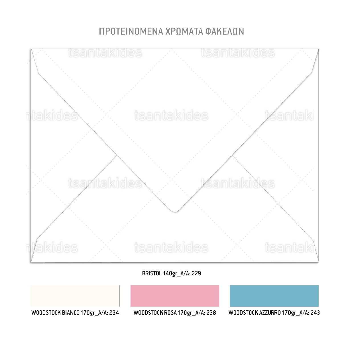 Η κάρτα του προσκλητηρίου είναι τυπωμένη σε λευκό ματ χαρτί 250 γρ. Το προσκλητήριο διαθέτει φάκελο διάστασης 19,5 x 14,5 εκ. σε χαρτί της επιλογής σας από τους αναγραφόμενους κωδικούς.