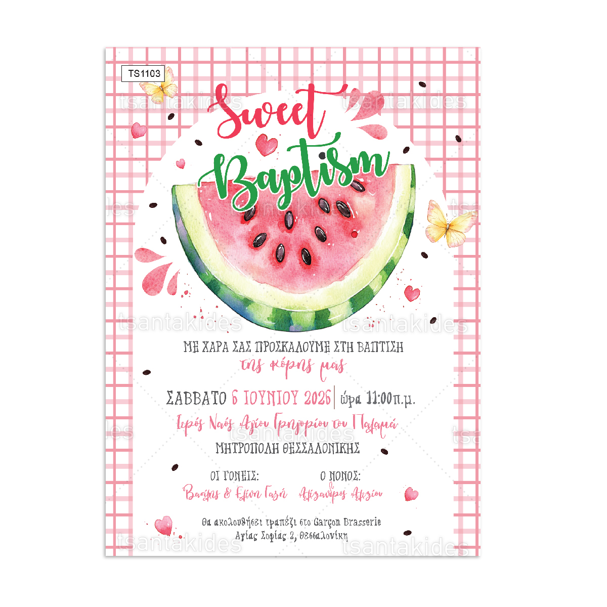 Προσκλητήριο βάπτισης για κορίτσι με θέμα Watermelon.