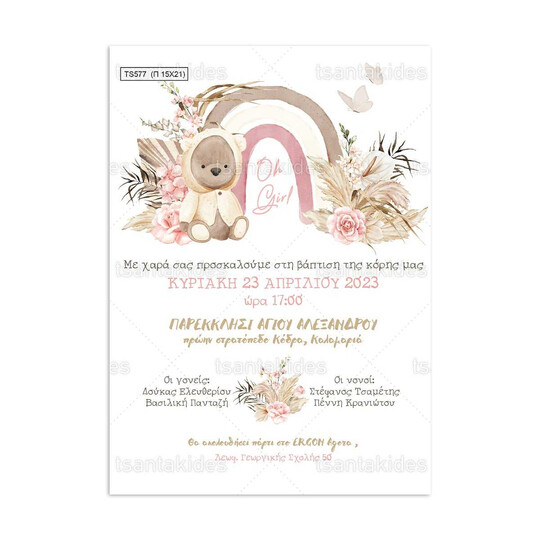 Προσκλητήριο βάπτισης παπυράκι εκτυπωμένο με θέμα Boho Teddy Bear