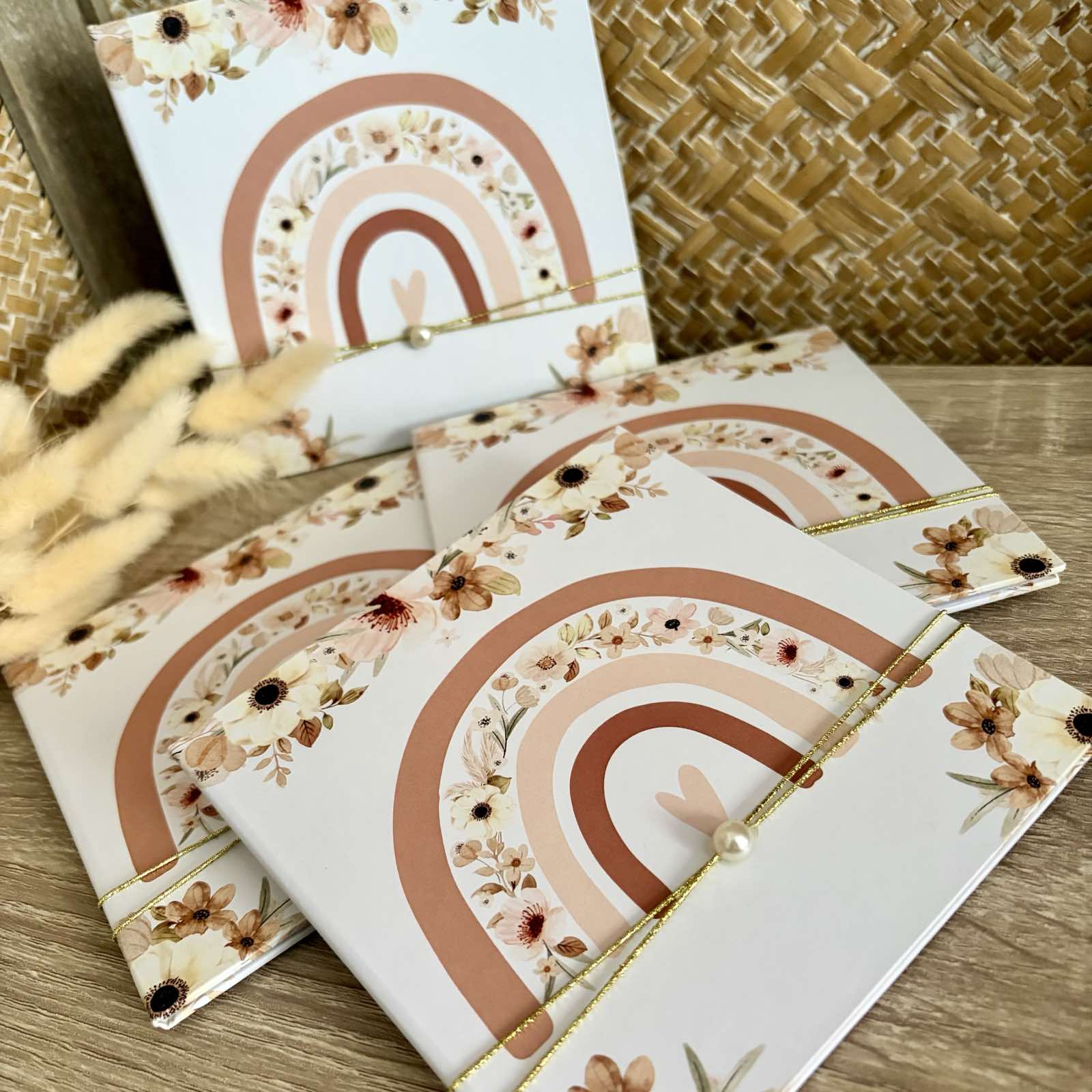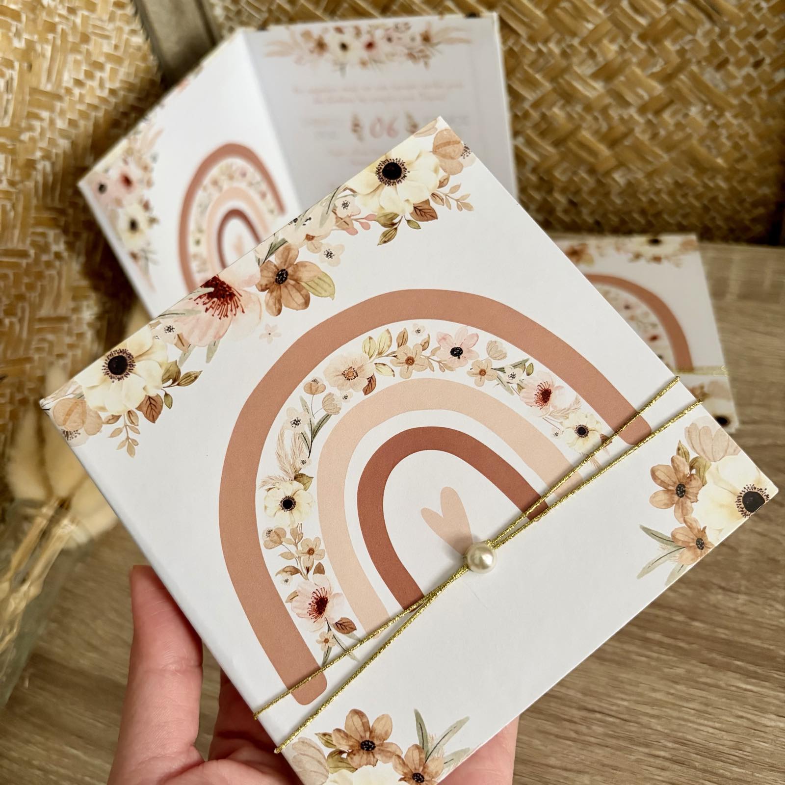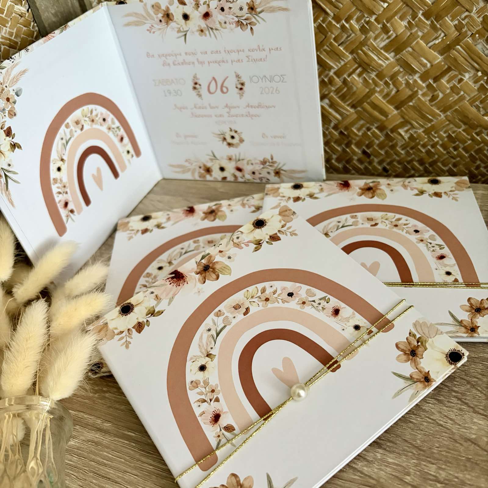 Προσκλητήριο βάπτισης βιβλιαράκι σκληρό εκτυπωμένο με θέμα Baby Floral Rainbow.