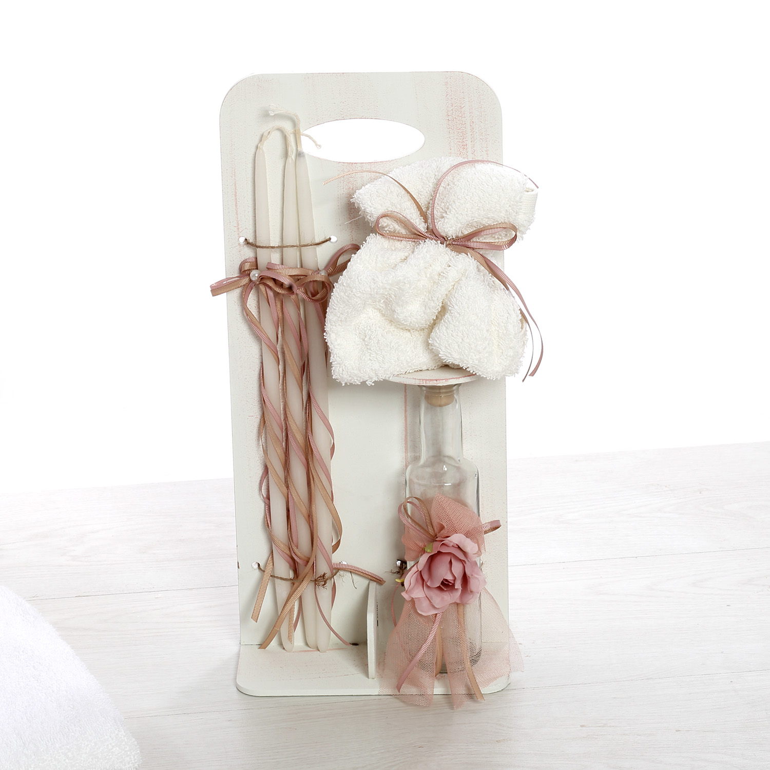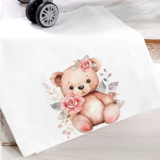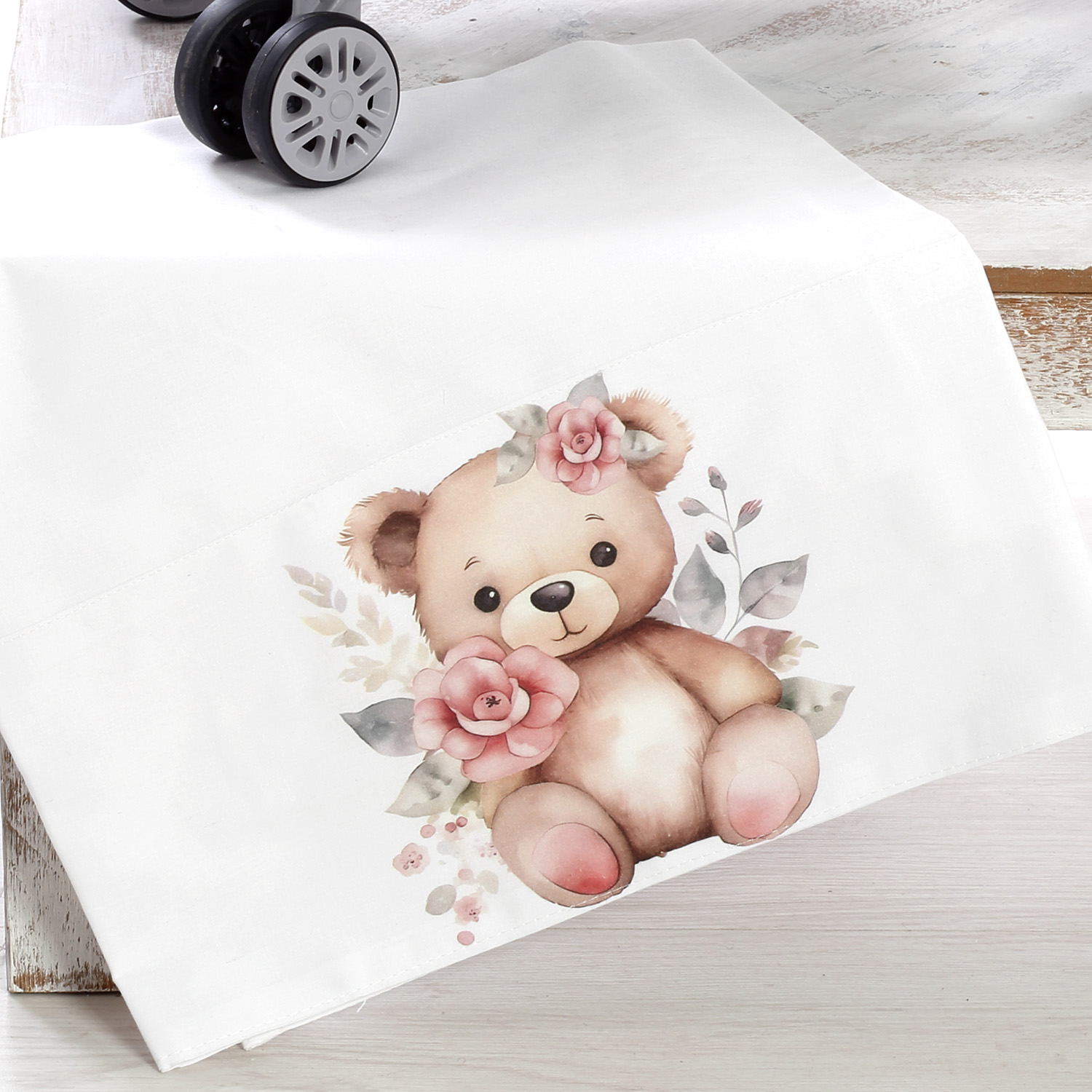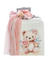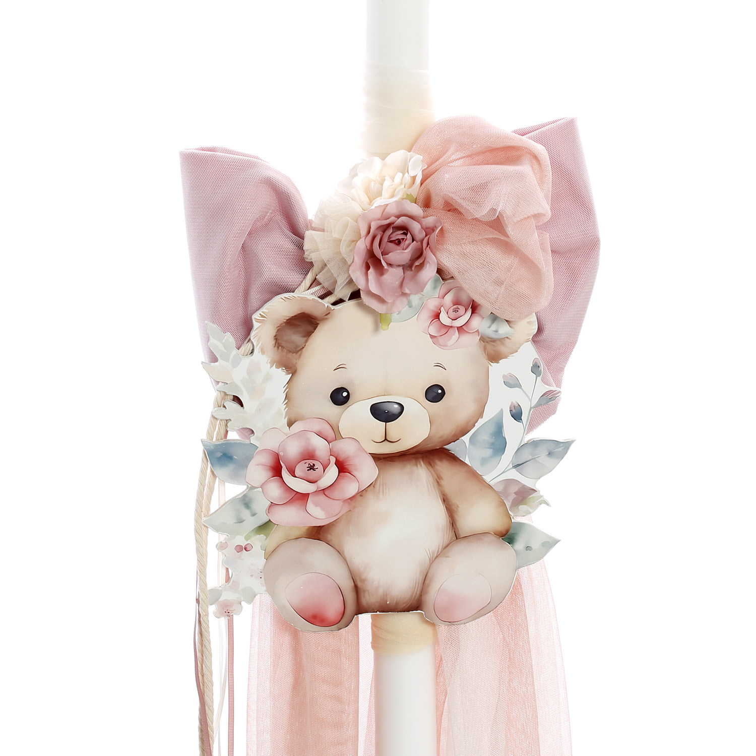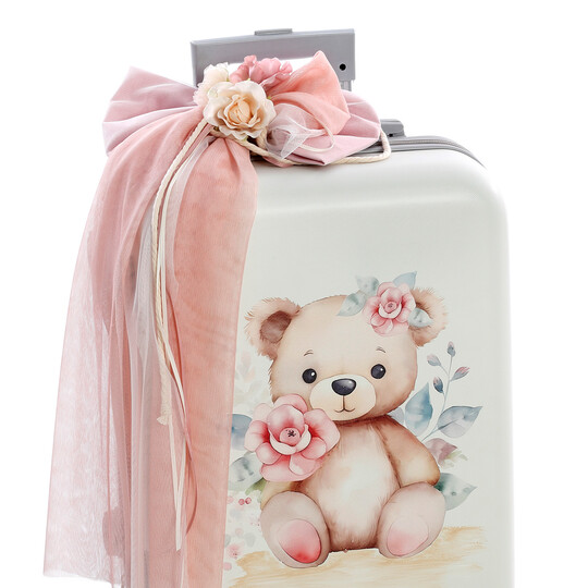 Ολοκληρωμένο βαπτιστικό σετ με θέμα το Αρκουδάκι με Λουλούδια, διακοσμημένο με υψηλής ποιότητας UV εκτύπωση σε ρομαντικές αποχρώσεις του ροζ και του λευκού. Ένα κομψό και γλυκό σετ, ιδανικό για μια ονειρική βάπτιση. Το σετ περιλαμβάνει:✔ Βαλίτσα τροχήλατη με UV εκτύπωση αρκουδάκι διακοσμημένο με ρομαντικά λουλούδια και φύλλα, στολισμένη με τούλια, κορδέλες και διακριτικά στοιχεία. (Διαστάσεις: 57cm x 40cm x 22cm)✔ Λαμπάδα βάπτισης, διακοσμημένη με ξύλινο στοιχείο UV εκτύπωσης αρκουδάκι, τούλια, φιόγκους και λουλουδάτα διακοσμητικά. ✔ Λαδόπανα & εσώρουχα, υψηλής ποιότητας, που περιλαμβάνουν:Μεγάλη πετσέτα με UV εκτύπωση αρκουδάκι και λουλούδιαΜικρή πετσέταΒαμβακερά εσώρουχα (φανελάκι, σλιπάκι, σκουφάκι)✔ Σετ λαδιού με μπουκαλάκι, σαπούνι και κεράκια, διακοσμημένα σε ρομαντικό στυλ με κορδέλες και λουλούδια.