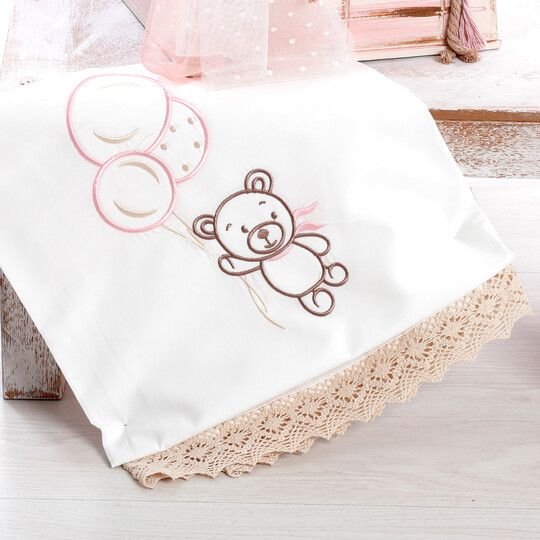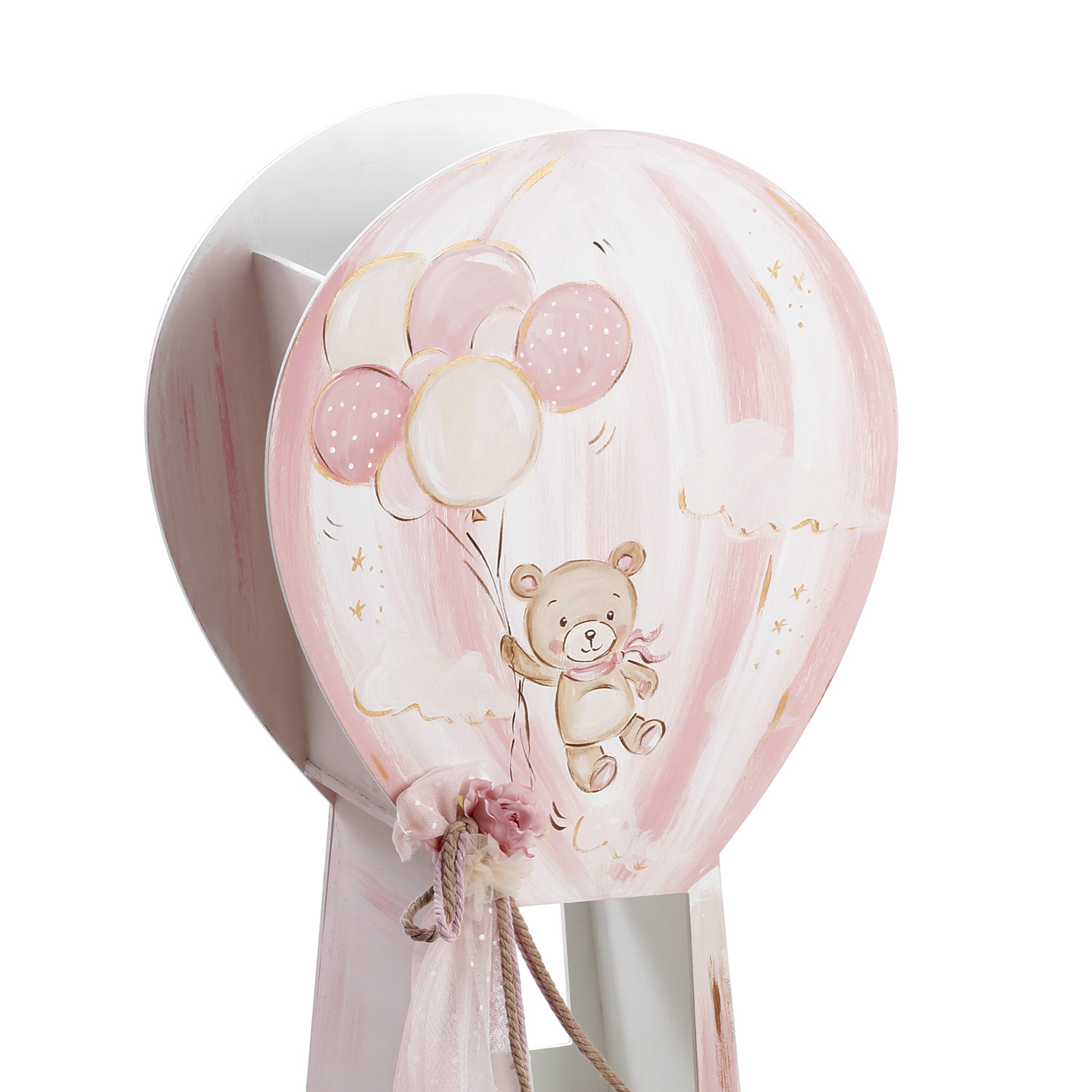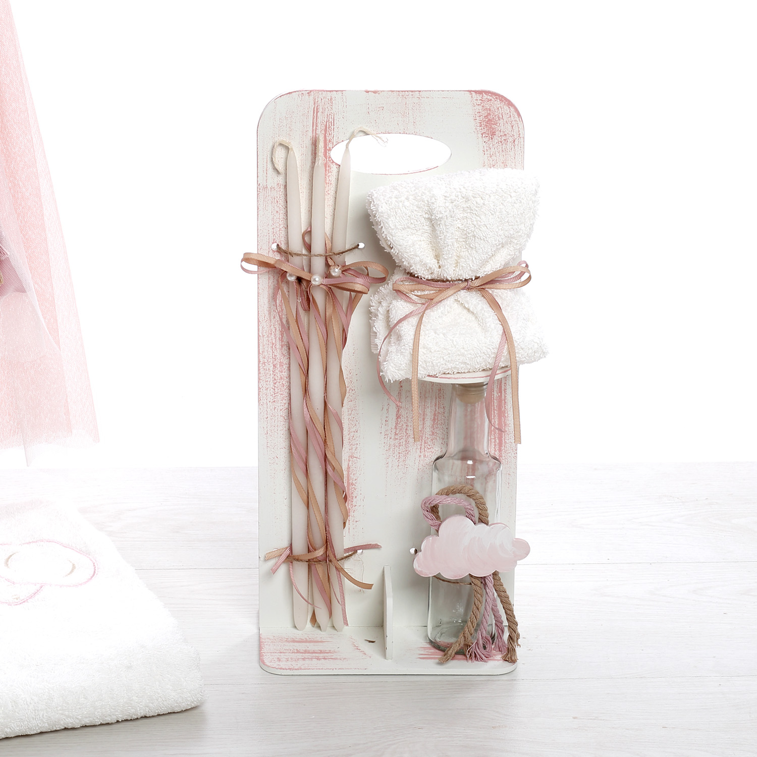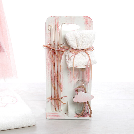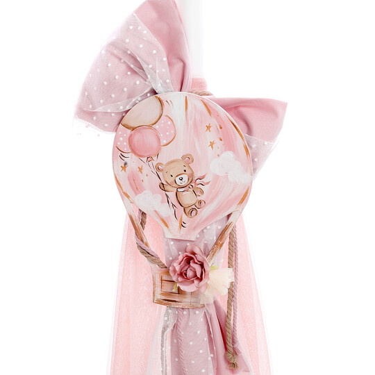 Ολοκληρωμένο βαπτιστικό σετ με θέμα το Αρκουδάκι σε Αερόστατο, διακοσμημένο με χειροποίητη ζωγραφική, σε ρομαντικές ροζ και παστέλ αποχρώσεις. Ένα κομψό και παραμυθένιο σετ για μια ξεχωριστή βάπτιση. Το σετ περιλαμβάνει:✔ Ξύλινο κουτί βάπτισης σε σχήμα αερόστατου, ζωγραφισμένο στο χέρι, με αρκουδάκι, μπαλόνια και σύννεφα. (Διαστάσεις: 75cm x 45cm x 30cm)✔ Λαμπάδα βάπτισης, διακοσμημένη με ξύλινο στοιχείο αερόστατο, πολυτελείς φιόγκους, τούλια και διακοσμητικά λουλούδια. ✔ Λαδόπανα & εσώρουχα, υψηλής ποιότητας, που περιλαμβάνουν:Μεγάλη πετσέτα με χειροποίητο κέντημα αρκουδάκι σε αερόστατοΜικρή πετσέταΒαμβακερά εσώρουχα (φανελάκι, σλιπάκι, σκουφάκι)✔ Σετ λαδιού με μπουκαλάκι, σαπούνι και κεράκια, διακοσμημένα με ροζ κορδέλες και διακριτικά στοιχεία.