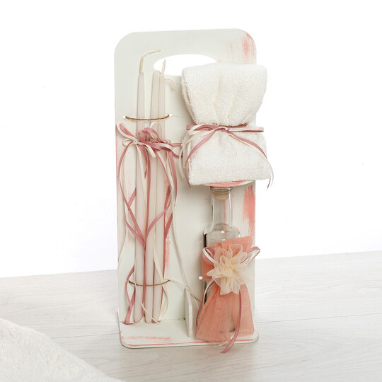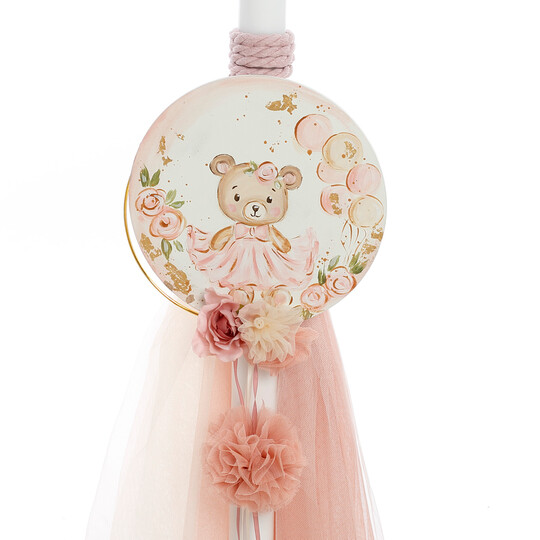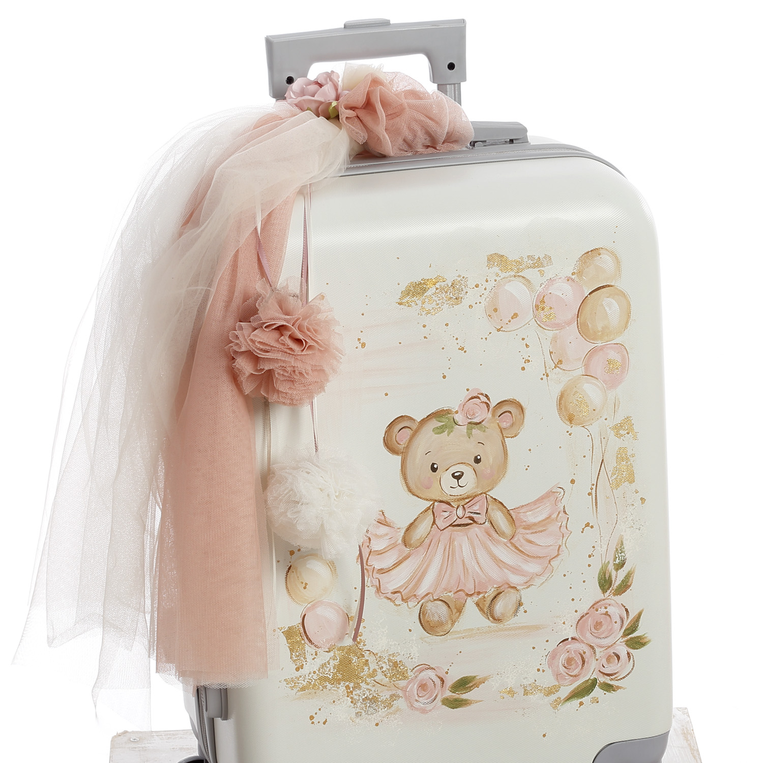 Ολοκληρωμένο πακέτο βάπτισης για κορίτσι από τη συλλογή "Ballerina Bear". Μια τρυφερή και καλλιτεχνική πρόταση που ξεχωρίζει για το χειροποίητο ζωγραφιστό αποτέλεσμα πάνω στη βαλίτσα, προσδίδοντας μια μοναδική αίσθηση πολυτέλειας.Το Σετ Περιλαμβάνει:Βαλίτσα Τρόλεϊ: Υψηλής ποιότητας βαλίτσα καμπίνας (σκληρό κέλυφος) με 4 ρόδες. Διαθέτει εντυπωσιακό ζωγραφιστό θέμα με αρκουδάκι μπαλαρίνα, μπαλόνια και λουλούδια, στολισμένη με πλούσιο ροζ τούλι και υφασμάτινα pom-poms. (Διαστάσεις: 57cm x 40cm x 22cm).Λαμπάδα: Εντυπωσιακός στολισμός με πλούσιο ροζ τούλι, υφασμάτινα λουλούδια και ξύλινο στρογγυλό κάδρο που απεικονίζει το ζωγραφιστό θέμα της συλλογής.Λαδόπανα: Πλήρες σετ (πετσέτες, εσώρουχα) με εξαιρετική βαμβακερή δαντέλα στο τελείωμα και τυπωμένο διακοσμητικό στοιχείο ασορτί με το θέμα.Σετ Λαδιού: Ξύλινο λευκό stand με πατίνα που περιέχει μπουκάλι λαδιού, σαπούνι και 3 κεράκια, όλα ασορτί διακοσμημένα με ροζ γάζα και λουλούδια.Σημειώσεις:1. Υπάρχει δυνατότητα επιλογής χρωμάτων στα υφάσματα και τους στολισμούς.