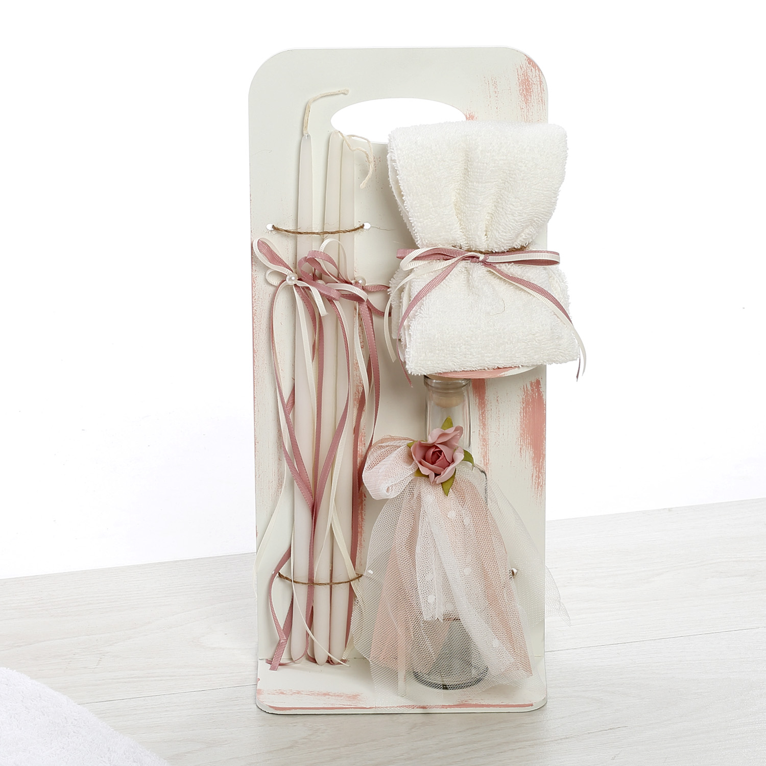 Ολοκληρωμένο πακέτο βάπτισης για κορίτσι με το διαχρονικό και αγαπημένο θέμα "Pink Bear" (Ροζ Αρκουδάκι). Μια πολύ τρυφερή και ρομαντική επιλογή που ξεχωρίζει χάρη στην ιδιαίτερη, εξάγωνη κατασκευή του κουτιού.Το Σετ Περιλαμβάνει:Ξύλινο Κουτί: Ιδιαίτερο εξάγωνο κουτί αποθήκευσης σε λευκές και ροζ αποχρώσεις, διακοσμημένο με τη φιγούρα του αρκούδου και ροζ φιόγκο.Λαμπάδα: Στολισμένη με ροζ υφάσματα (τύπου φουστίτσα) και ξύλινη φιγούρα με το ροζ αρκουδάκι.Λαδόπανα: Πλήρες σετ (πετσέτες, εσώρουχα) με τυπωμένη παράσταση στο θέμα της βάπτισης.Σετ Λαδιού: Ξύλινο stand που περιέχει μπουκάλι, σαπούνι και 3 κεράκια, όλα ασορτί διακοσμημένα με ροζ κορδέλες και υφασμάτινα λουλουδάκια.Σημειώσεις:1. Υπάρχει δυνατότητα επιλογής χρωμάτων στα υφάσματα και τους στολισμούς. 2. Όλα τα προϊόντα του πακέτου (κουτί, λαμπάδα, σετ λαδιού, λαδόπανα) διατίθενται και μεμονωμένα.