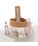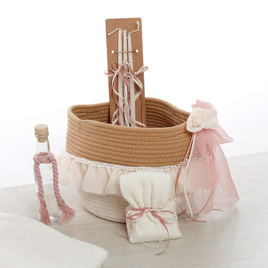 Ολοκληρωμένο πακέτο βάπτισης για κορίτσι από τη συλλογή "Rustic Romance". Μια πρόταση που συνδυάζει την ακατέργαστη γοητεία των φυσικών υλικών με την κομψότητα της δαντέλας και του τούλιου, προσφέροντας ένα λειτουργικό και καλαίσθητο αποτέλεσμα.Το Σετ Περιλαμβάνει:Καλάθι Rope (Μεγάλο): Δίχρωμο καλάθι από ανθεκτικό βαμβακερό σχοινί σε φυσική και λευκή απόχρωση. Είναι διακοσμημένο με πλούσιο βολάν από τούλι και δαντέλα, υφασμάτινα τριαντάφυλλα και ένα κομψό Plexiglass μονόγραμμα (π.χ. "Π"). (Διαστάσεις: 50cm x 40cm x 40cm).Λαμπάδα: Εντυπωσιακός στολισμός με πλούσιες στρώσεις από τούλι και δαντέλα, υφασμάτινα λουλούδια και το αντίστοιχο Plexiglass αρχικό γράμμα.Λαδόπανα: Πλήρες σετ (πετσέτες, εσώρουχα) από 100% βαμβάκι υψηλής ποιότητας, με τελείωμα από φαρδιά boho δαντέλα και διακοσμητικό υφασμάτινο λουλούδι.Σετ Λαδιού (σε Μικρό Καλάθι): Περιλαμβάνει ένα δεύτερο μικρότερο καλάθι rope που φιλοξενεί το μπουκάλι λαδιού, το σαπούνι και τα 3 κεράκια κολυμπήθρας, όλα ασορτί διακοσμημένα με δαντέλα και άνθη.Σημειώσεις:1. Υπάρχει δυνατότητα επιλογής χρωμάτων στα υφάσματα και τους στολισμούς.