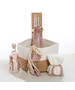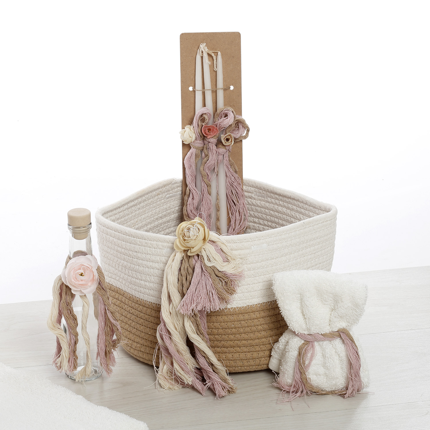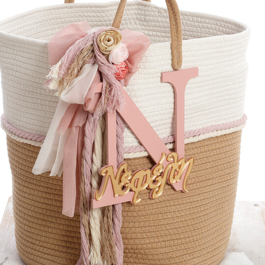 Ολοκληρωμένο premium πακέτο βάπτισης για κορίτσι από τη συλλογή "Signature Boho". Μια άκρως εμπορική και κομψή πρόταση που βασίζεται στα πρακτικά καλάθια αποθήκευσης και αναδεικνύεται μέσα από προσωποποιημένες ξύλινες λεπτομέρειες και ποιοτικές δαντέλες.Το Σετ Περιλαμβάνει:Καλάθι Rope (Μεγάλο): Δίχρωμο καλάθι (φυσικό/λευκό) από χοντρό βαμβακερό σχοινί με λαβές. Στολισμένο με πλούσιες boho υφές (κρόσσια, γάζες), λουλούδια και ξύλινο μονόγραμμα με το όνομα της επιλογής σας.Λαμπάδα: Εντυπωσιακή λαμπάδα με πλούσιο boho στολισμό σε γήινες και dusty pink αποχρώσεις, διακοσμημένη με ξύλινο στοιχείο (αρχικό γράμμα και όνομα).Λαδόπανα: Πλήρες σετ (πετσέτες, εσώρουχα) που ξεχωρίζει για την προσωποποίηση με κεντημένο όνομα και το εξαιρετικό τελείωμα με βαμβακερή boho δαντέλα.Σετ Λαδιού (σε Μικρό Καλάθι): Περιλαμβάνει ένα δεύτερο μικρότερο καλάθι rope που φιλοξενεί το μπουκάλι, το σαπούνι και τα 3 κεράκια, όλα ασορτί διακοσμημένα.Σημειώσεις:1. Υπάρχει δυνατότητα επιλογής χρωμάτων στα υφάσματα και τους στολισμούς.