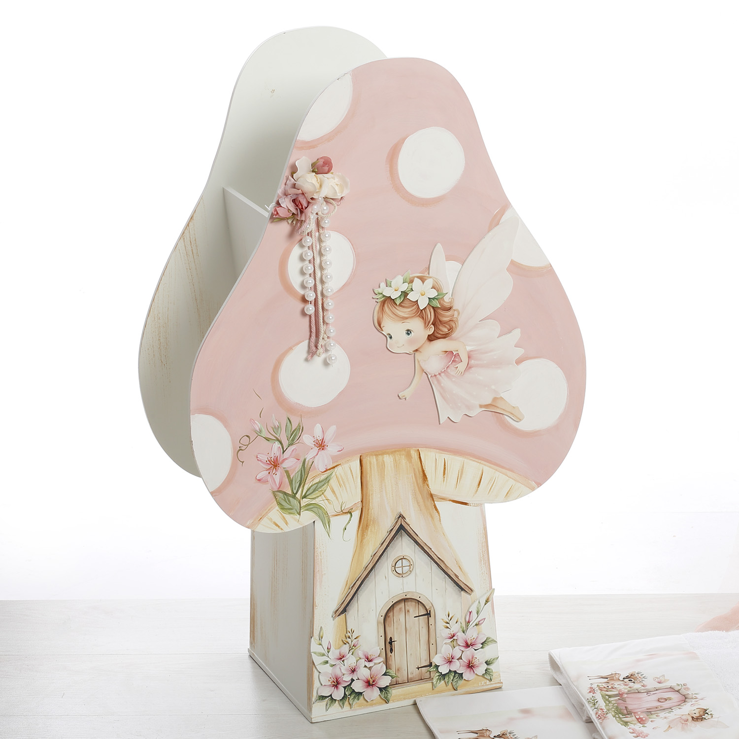 - Ξύλινο Κουτί (Μανιτάρι): Ειδικής κατασκευής ξύλινο κουτί σε σχήμα μανιταρόσπιτου. Διακοσμημένο με υπέροχες παραστάσεις νεράιδας και λουλουδιών σε παστέλ ροζ αποχρώσεις, με προσθήκη από πέρλες και 3D floral στοιχεία.