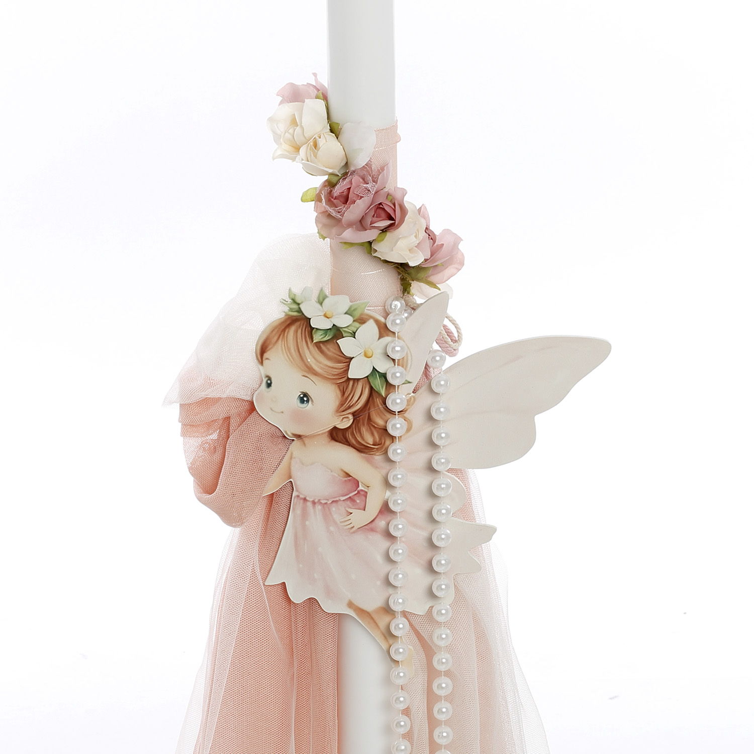 - Λαμπάδα: Εντυπωσιακή λαμπάδα στολισμένη με πλούσιο ροζ/σομόν τούλι, κρεμαστές πέρλες, υφασμάτινα λουλούδια και ξύλινη φιγούρα με τη νεράιδα.