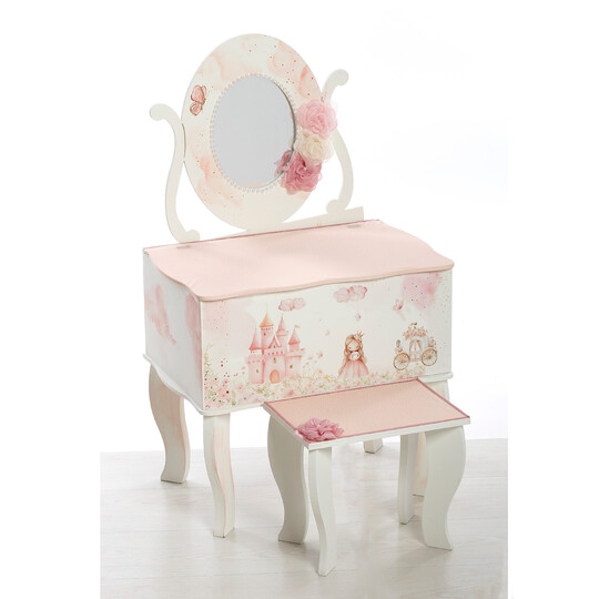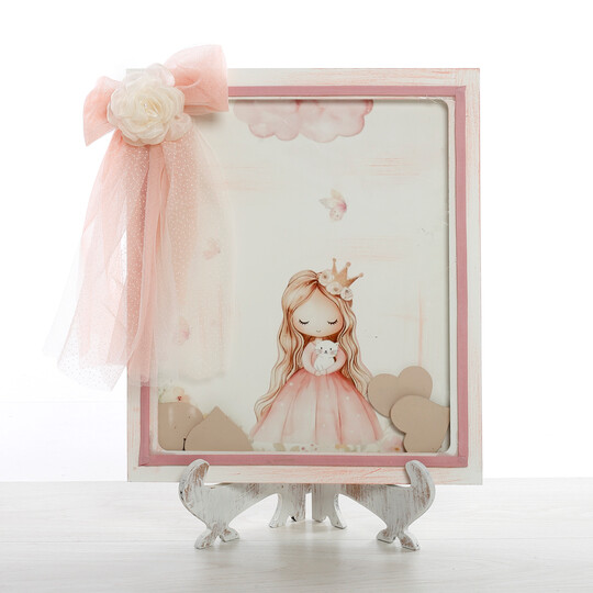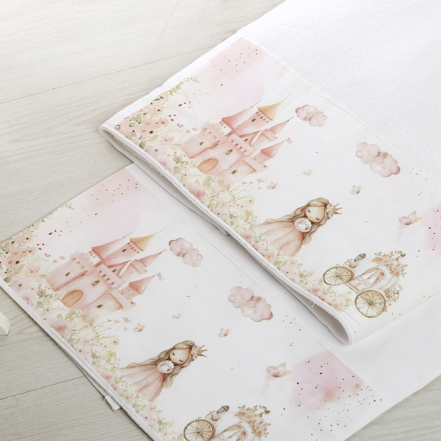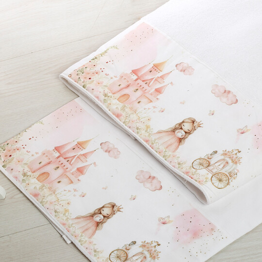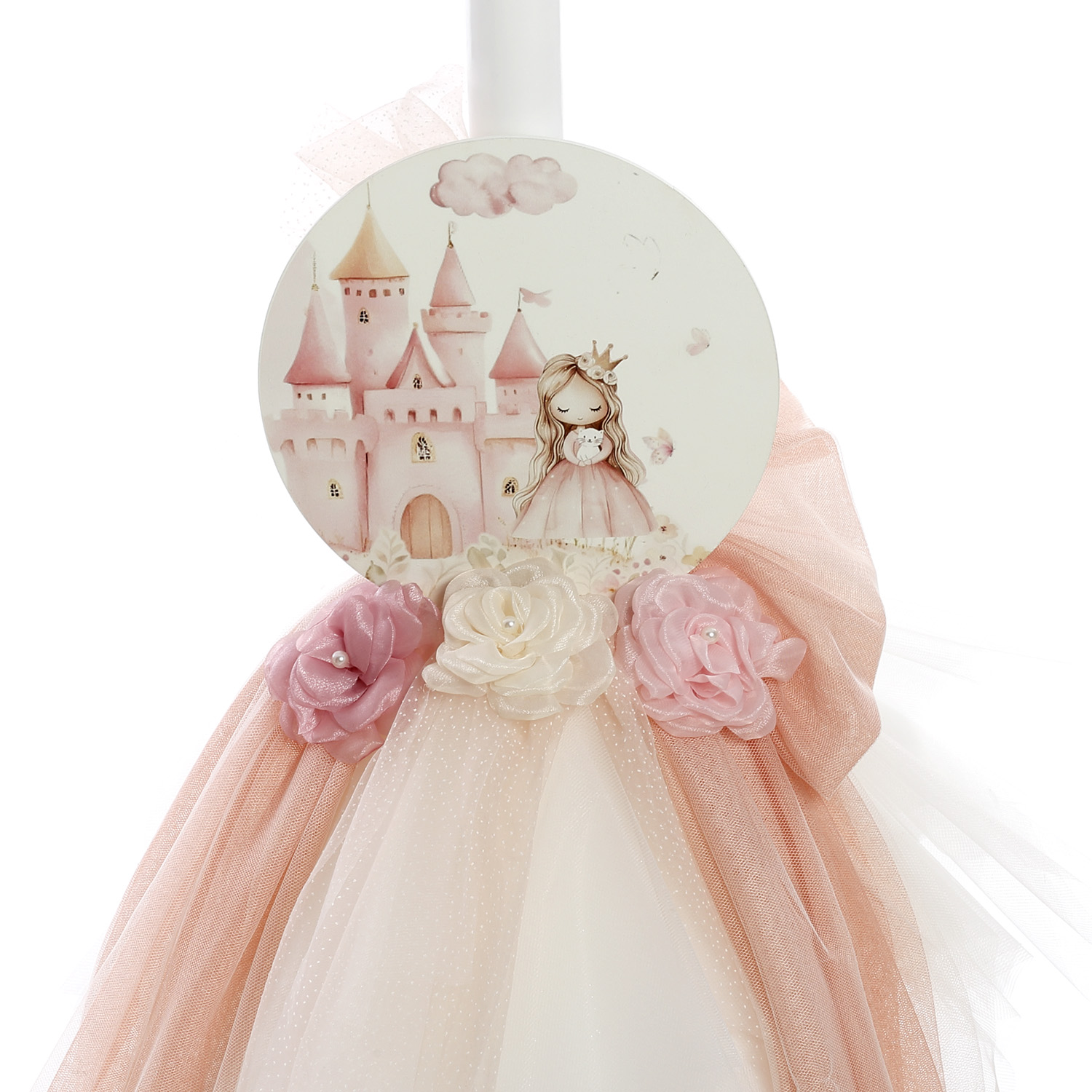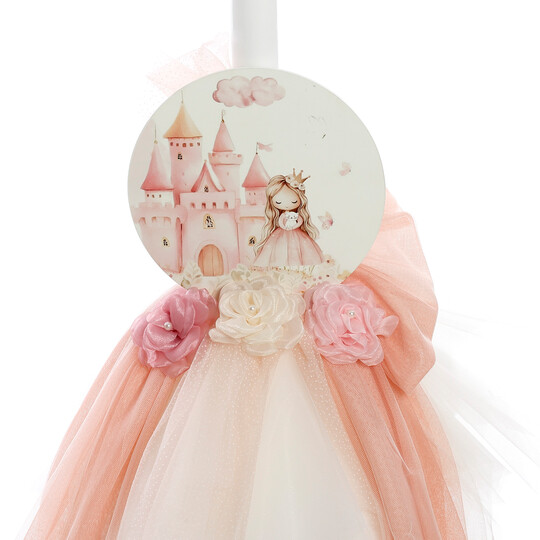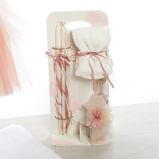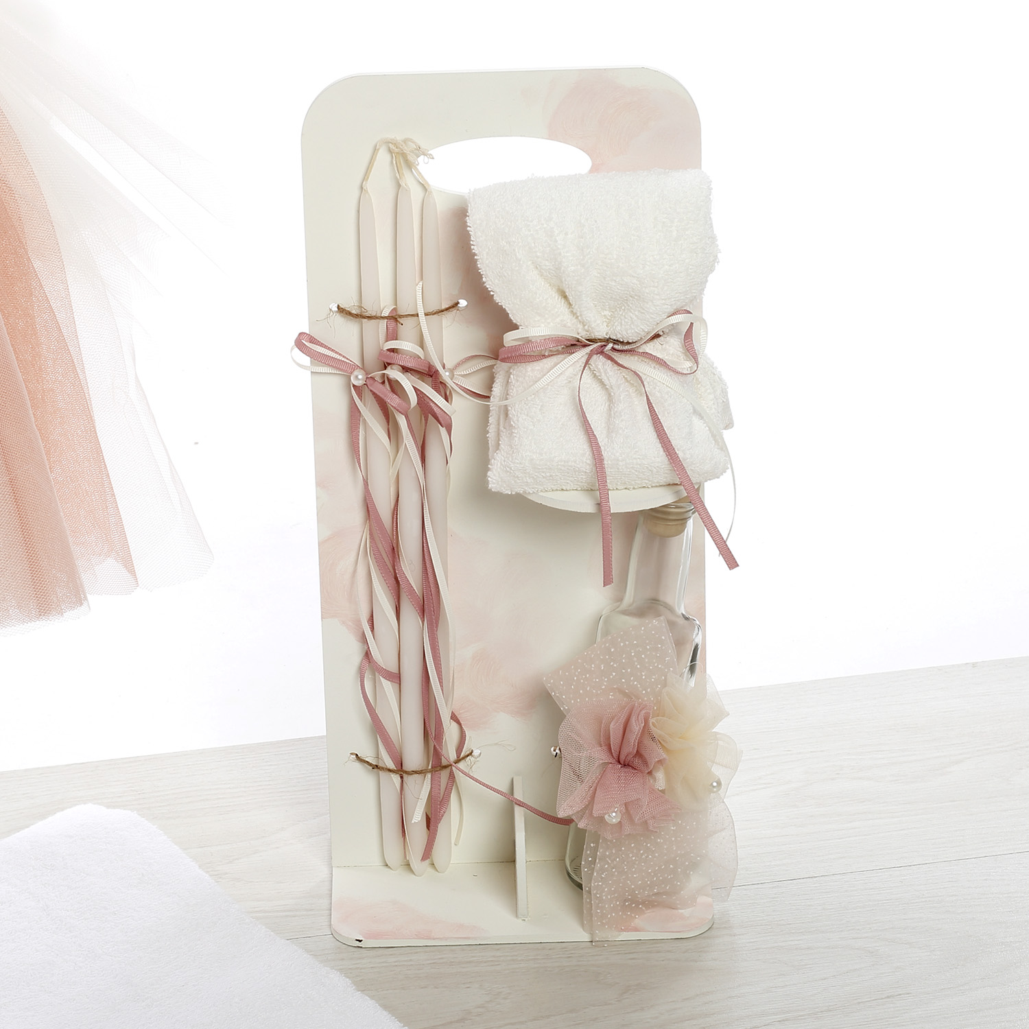 Ολοκληρωμένο premium πακέτο βάπτισης για κορίτσι με το απόλυτο παραμυθένιο θέμα "Princess Castle" (Πριγκίπισσα & Κάστρο). Το Σετ Περιλαμβάνει:Ξύλινο Μπουντουάρ & Σκαμπό: Κομψό έπιπλο (τουαλέτα ομορφιάς) με ενσωματωμένο καθρέφτη, συρτάρι αποθήκευσης και ασορτί ξύλινο σκαμπό. Διακοσμημένο με ονειρικές παραστάσεις πριγκίπισσας, κάστρου και άμαξας σε παστέλ ροζ αποχρώσεις, εμπλουτισμένο με 3D υφασμάτινα λουλούδια.Λαμπάδα: Εντυπωσιακή λαμπάδα στολισμένη με πλούσιο ροζ και λευκό τούλι (τύπου φόρεμα), λουλούδια και στρογγυλό ξύλινο καδράκι με το παραμυθένιο κάστρο.Λαδόπανα: Πλήρες σετ (πετσέτες, εσώρουχα) με τυπωμένη παράσταση απόλυτα εναρμονισμένη με το θέμα της βάπτισης.Σετ Λαδιού: Ξύλινο stand που περιέχει μπουκάλι, σαπούνι και 3 κεράκια, όλα ασορτί διακοσμημένα με ροζ λεπτομέρειες.Σημειώσεις:1. Υπάρχει δυνατότητα επιλογής χρωμάτων στα υφάσματα και τους στολισμούς.