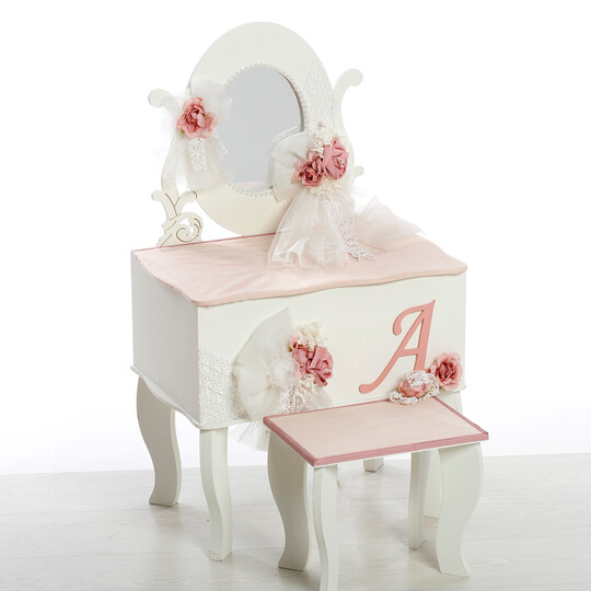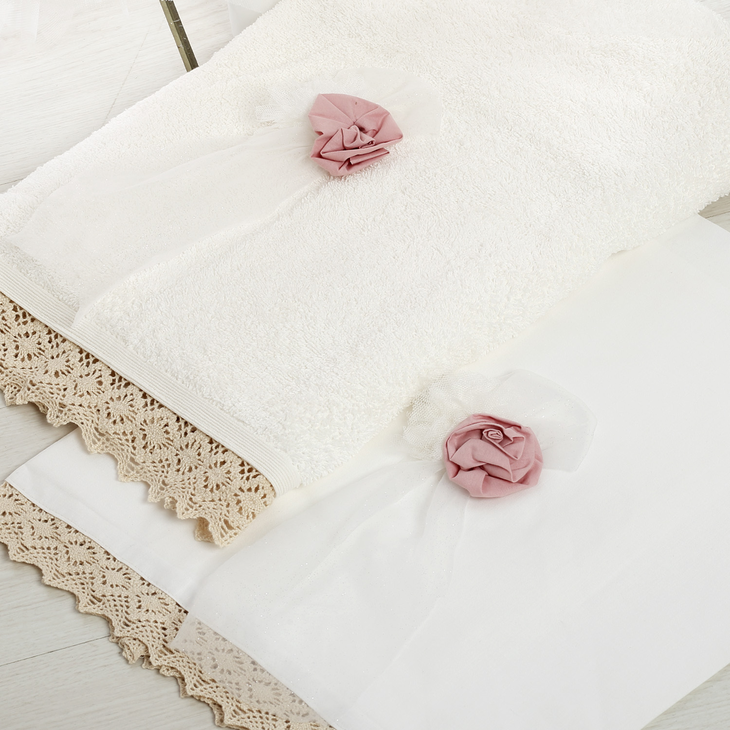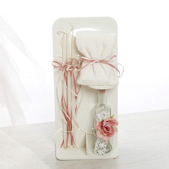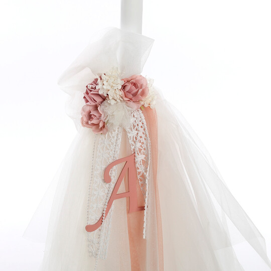 Ολοκληρωμένο πολυτελές πακέτο βάπτισης για κορίτσι από τη συλλογή "Signature Rose". Μια αριστοκρατική πρόταση που συνδυάζει τη διαχρονική γοητεία του χειροποίητου επίπλου με ρομαντικές λεπτομέρειες από δαντέλα και τριαντάφυλλα.Το Σετ Περιλαμβάνει:Ξύλινο Μπουντουάρ & Σκαμπό: Χειροποίητο έπιπλο τουαλέτα σε λευκό και απαλό ροζ χρώμα, με καθρέφτη και αποθηκευτικό χώρο. Είναι διακοσμημένο με περίτεχνη λευκή δαντέλα, συνθέσεις από τριαντάφυλλα και ένα εντυπωσιακό ξύλινο μονόγραμμα (π.χ. "Α"). (Διαστάσεις: 80cm x 50cm x 32cm).Λαμπάδα: Εξαιρετικά κομψή λαμπάδα στολισμένη με πλούσιο λευκό τούλι, δαντέλα, υφασμάτινα τριαντάφυλλα και το αντίστοιχο ξύλινο μονόγραμμα.Λαδόπανα: Πλήρες σετ (πετσέτες, εσώρουχα) από εξαιρετικής ποιότητας βαμβάκι, με τελείωμα από φαρδιά δαντέλα και διακόσμηση με μικρά τριαντάφυλλα.Σετ Λαδιού: Λευκό ξύλινο stand που περιλαμβάνει μπουκάλι λαδιού, σαπούνι και 3 κεράκια, όλα ασορτί διακοσμημένα με δαντέλα και ροζ λουλούδια.Σημειώσεις:1. Υπάρχει δυνατότητα επιλογής χρωμάτων στα υφάσματα και τους στολισμούς.2. Όλα τα προϊόντα του πακέτου (μπουντουάρ, λαμπάδα, σετ λαδιού, λαδόπανα) διατίθενται και μεμονωμένα.
