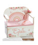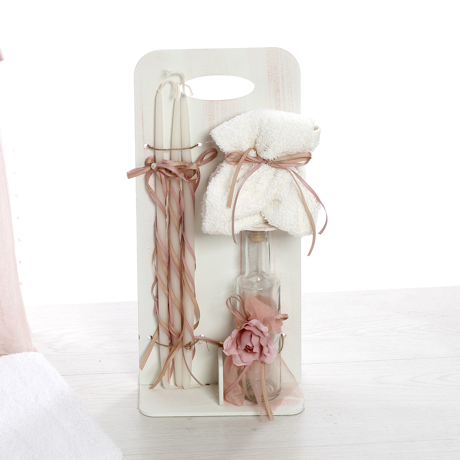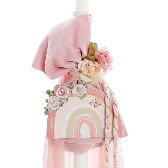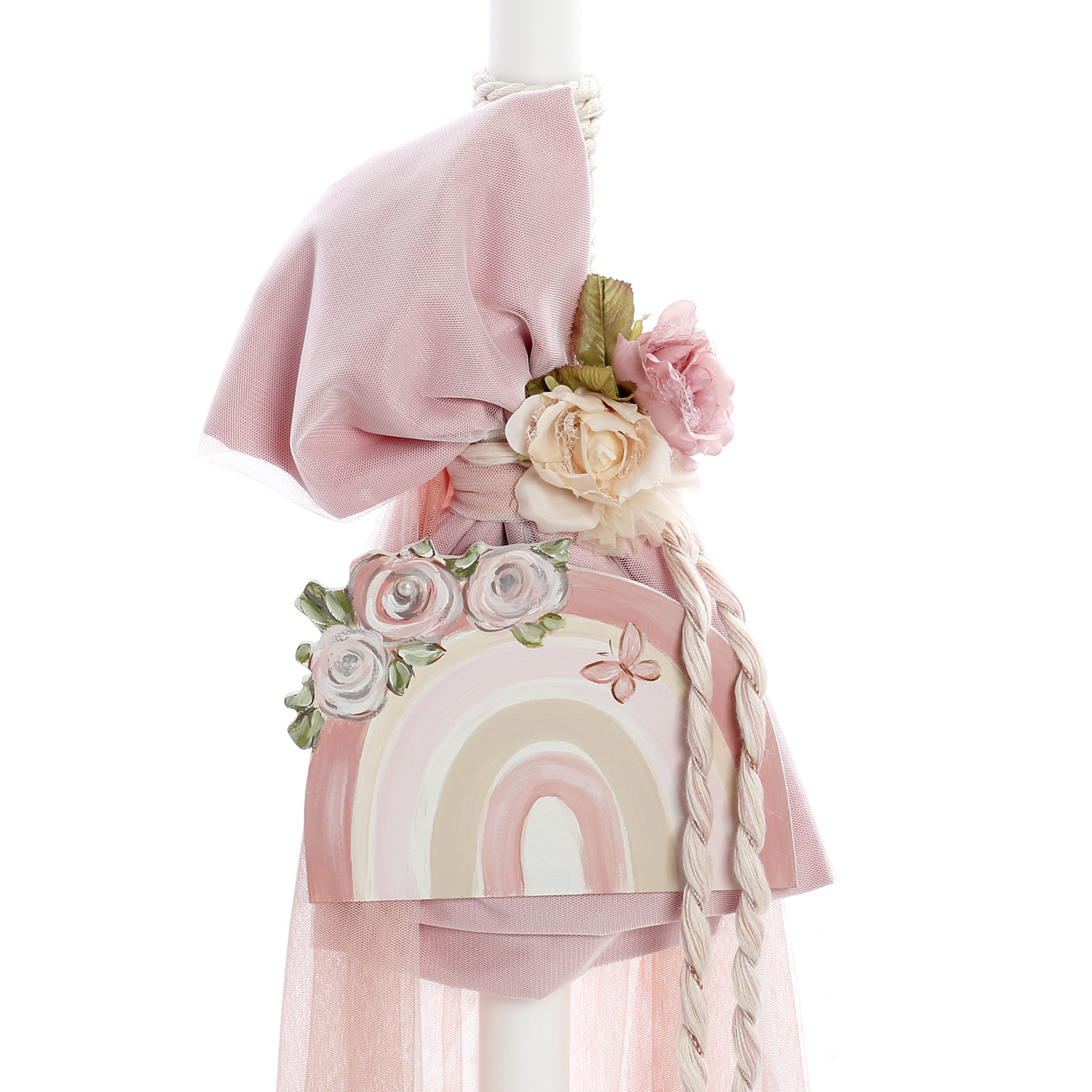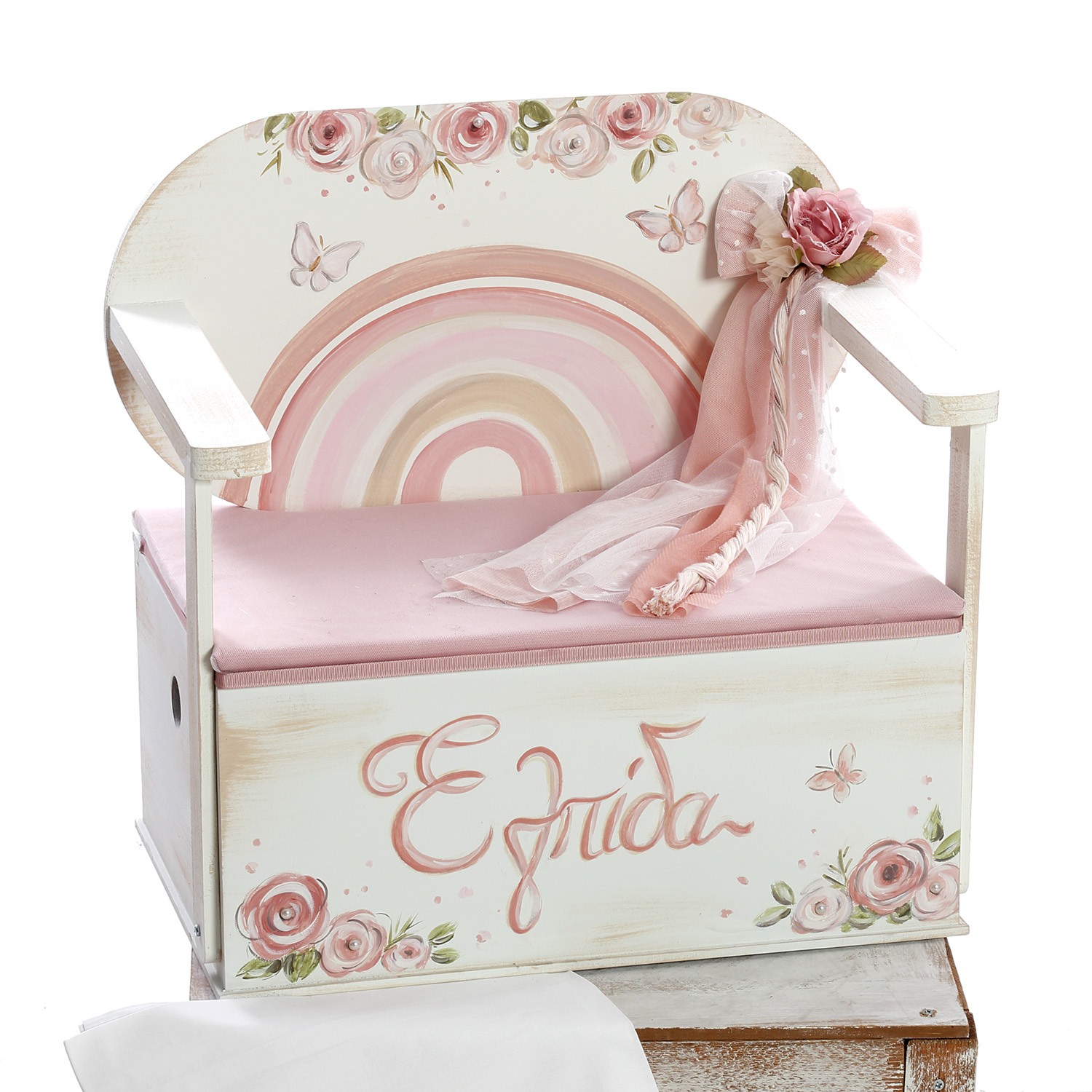 Ένα μοναδικό βαπτιστικό σετ με θέμα το Ουράνιο Τόξο, διακοσμημένο με χειροποίητη ζωγραφική, ρομαντικά λουλούδια και παστέλ αποχρώσεις του ροζ και του μπεζ. Ιδανικό για μια ονειρική και κομψή βάπτιση. Το σετ περιλαμβάνει:✔ Ξύλινο παγκάκι-κουτί βάπτισης ζωγραφισμένο στο χέρι, με ουράνιο τόξο, τριαντάφυλλα και πεταλούδες, δημιουργώντας μια ρομαντική αίσθηση. (Διαστάσεις: 50cm x 52cm x 32cm)✔ Λαμπάδα βάπτισης, διακοσμημένη με ξύλινο στοιχείο ουράνιο τόξο, πολυτελή τούλια, φιόγκους και λουλούδια. ✔ Λαδόπανα & εσώρουχα, υψηλής ποιότητας, που περιλαμβάνουν:Μεγάλη πετσέτα με χειροποίητη ζωγραφιά ουράνιο τόξο και τριαντάφυλλαΜικρή πετσέταΒαμβακερά εσώρουχα (φανελάκι, σλιπάκι, σκουφάκι)✔ Σετ λαδιού με μπουκαλάκι, σαπούνι και κεράκια, διακοσμημένα με κορδέλες και floral στοιχεία.