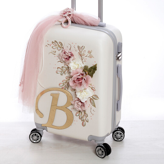 Σετ βάπτισης (Βαλίτσα,λαμπάδα,σταν λαδιού,λαδόπανο) με θέμα λουλούδια μονόγραμμα ζωγραφισμένο στο χέρι.Διάσταση βαλίτσας (Υ.57 Μ.40 Π.22)