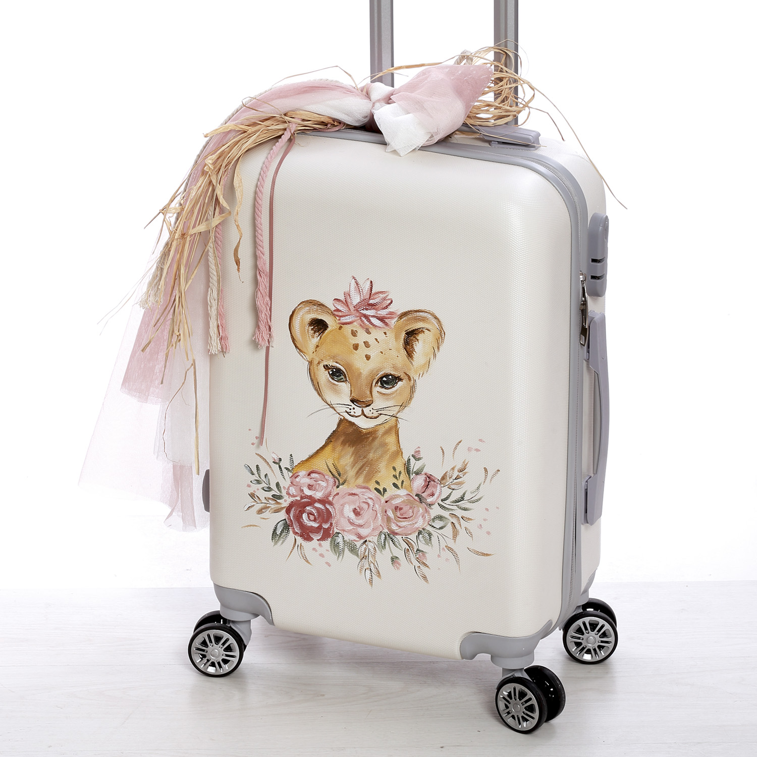 Σετ βάπτισης (Βαλίτσα,λαμπάδα,σταν λαδιού,λαδόπανο) με θέμα Τιγράκι ζωγραφισμένο στο χέρι.Διάσταση Βαλίτσας (Υ.57 Μ.40 Π.22)