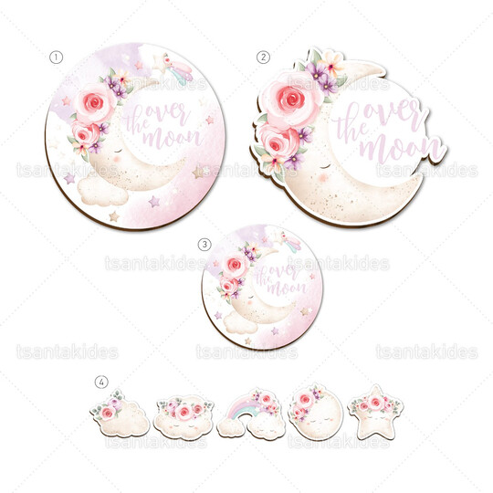 Ξύλινο σετ διακόσμησης εκτυπωμένο με θέμα Star Moon & Cloud With Flowers