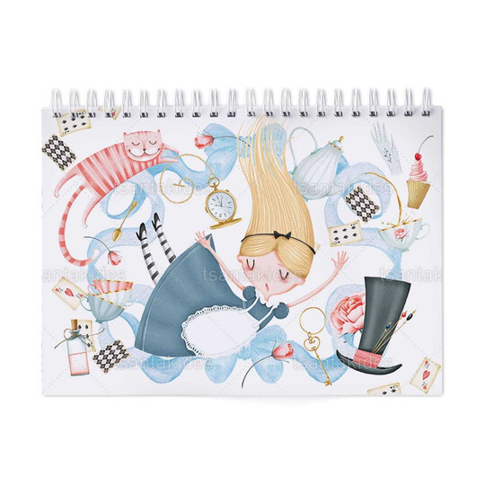 Παιδική μπομπονιέρα βάπτισης μπλοκ ζωγραφικής με διάσταση 21x29cm, εκτυπωμένο με θέμα Αλίκη Στη Χώρα Των Θαυμάτων.