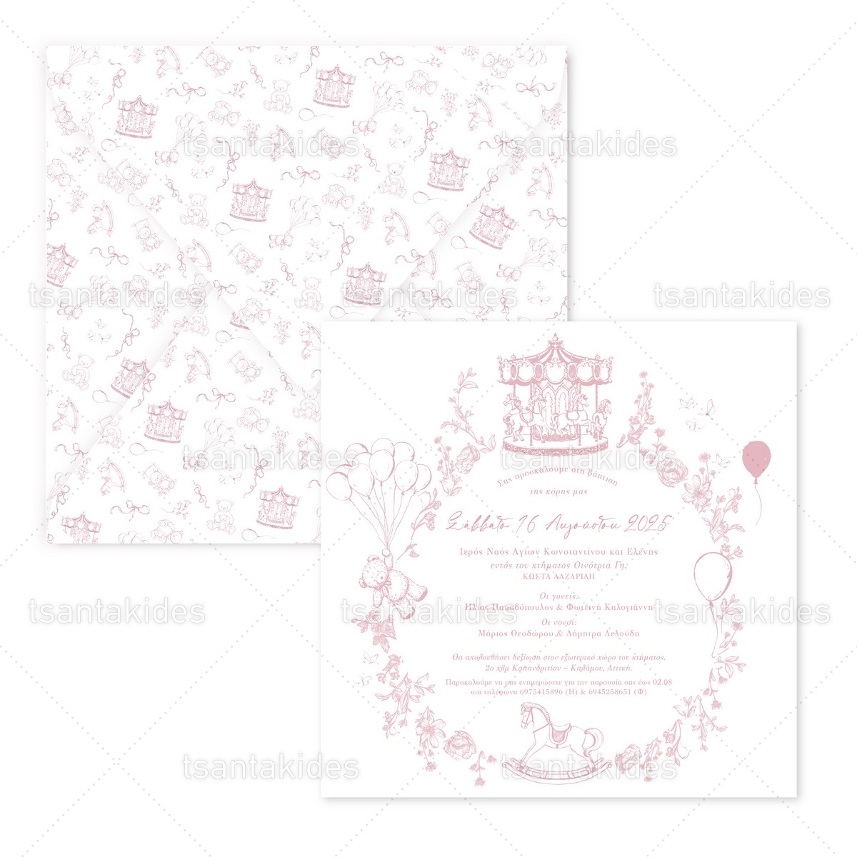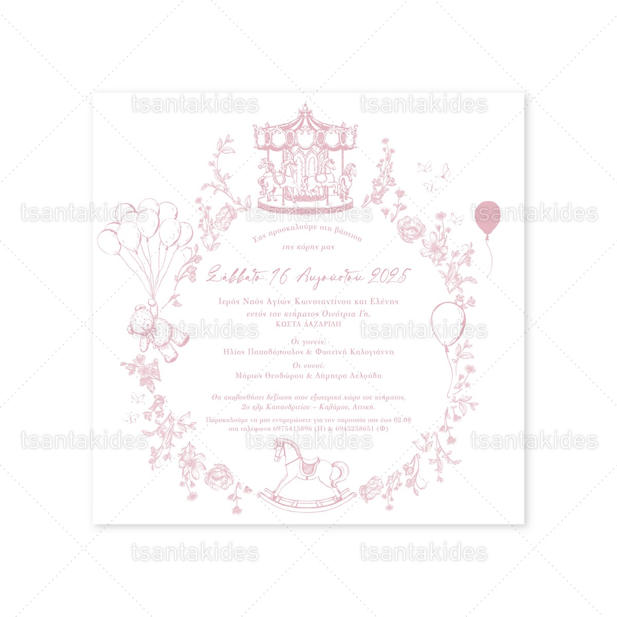 Προσκλητήριο βάπτισης για κορίτσι με θέμα Καρουζέλ.