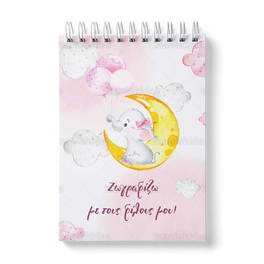 Παιδική μπομπονιέρα βάπτισης μπλοκάκι ζωγραφικής εκτυπωμένο με θέμα Ελεφαντάκι Στο Φεγγάρι.