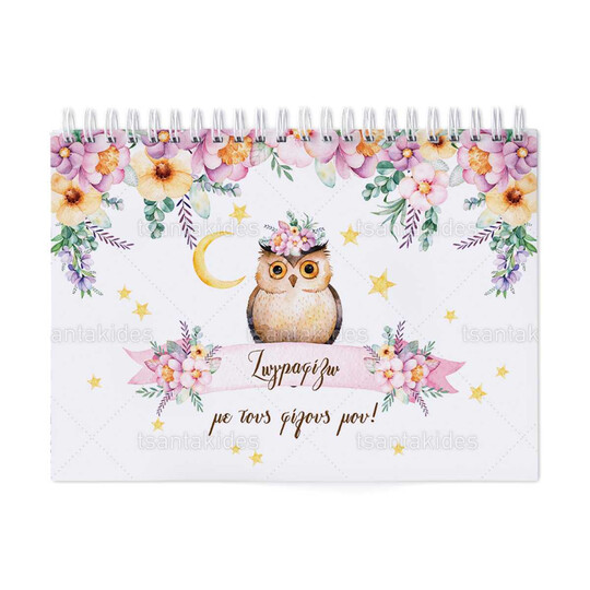 Παιδική μπομπονιέρα βάπτισης μπλοκ ζωγραφικής με διάσταση 21x29cm, εκτυπωμένο με θέμα Κουκουβάγια.