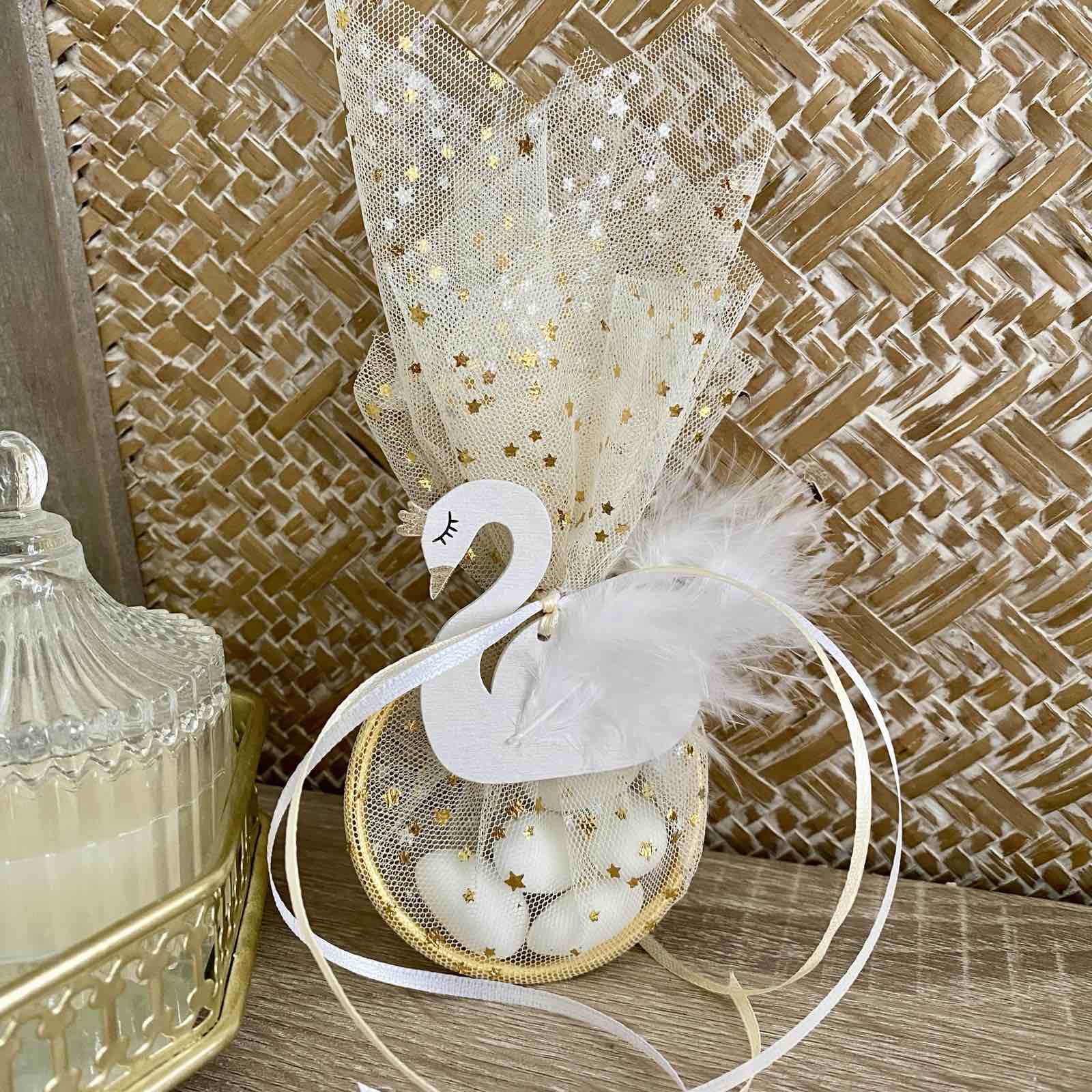 Μπομπονιέρα βάπτισης κύκνος μαγνητάκι δεμένο σε μεταλλικό χρυσό στεφάνι 7 εκ με τούλι με χρυσό γκλίτερ.