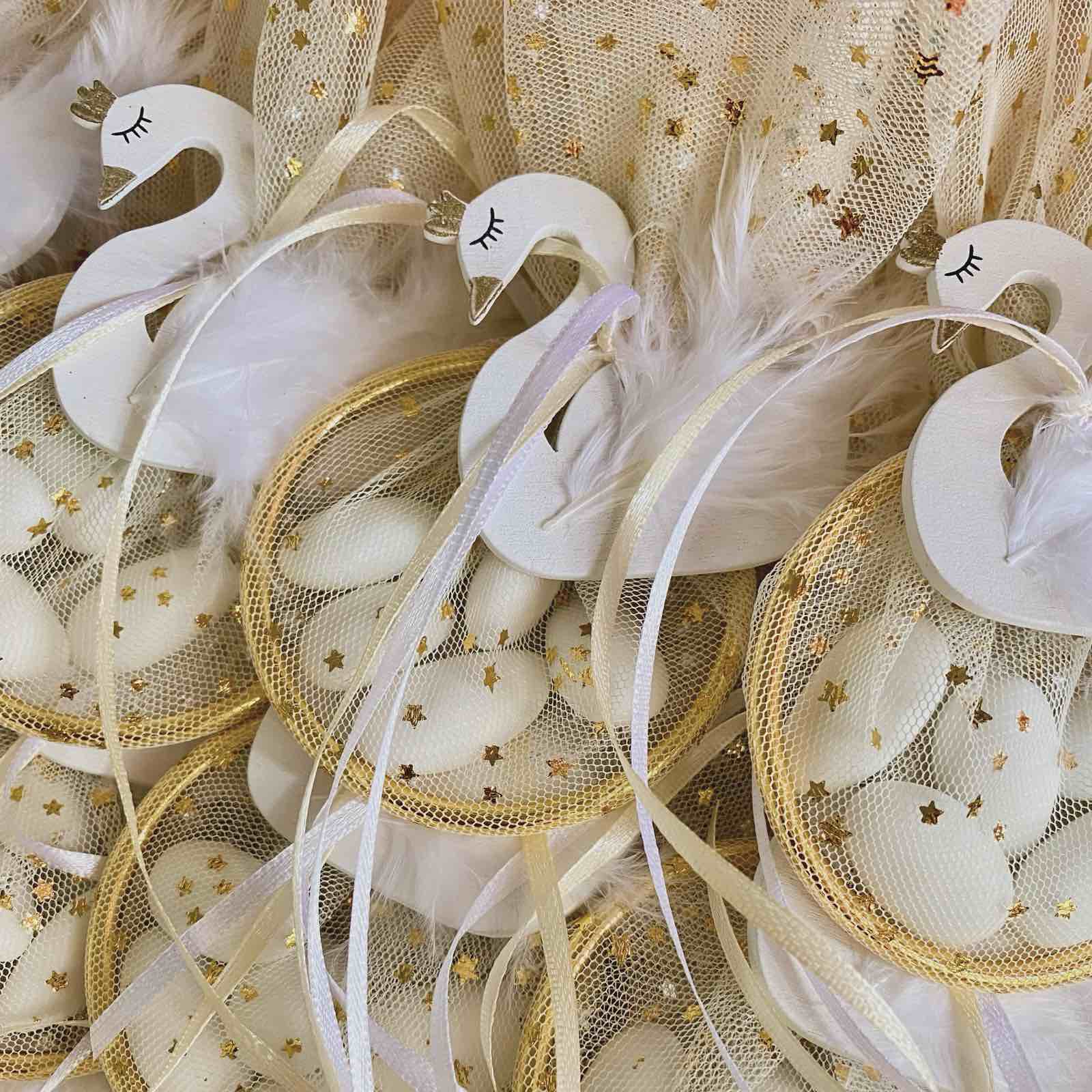 Μπομπονιέρα Βάπτισης Κύκνος Μαγνητάκι Σε Χρυσό Στεφάνι