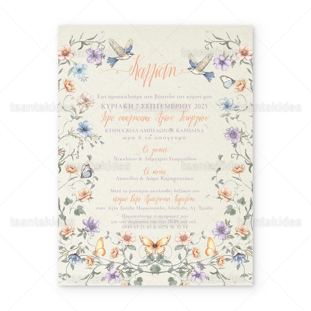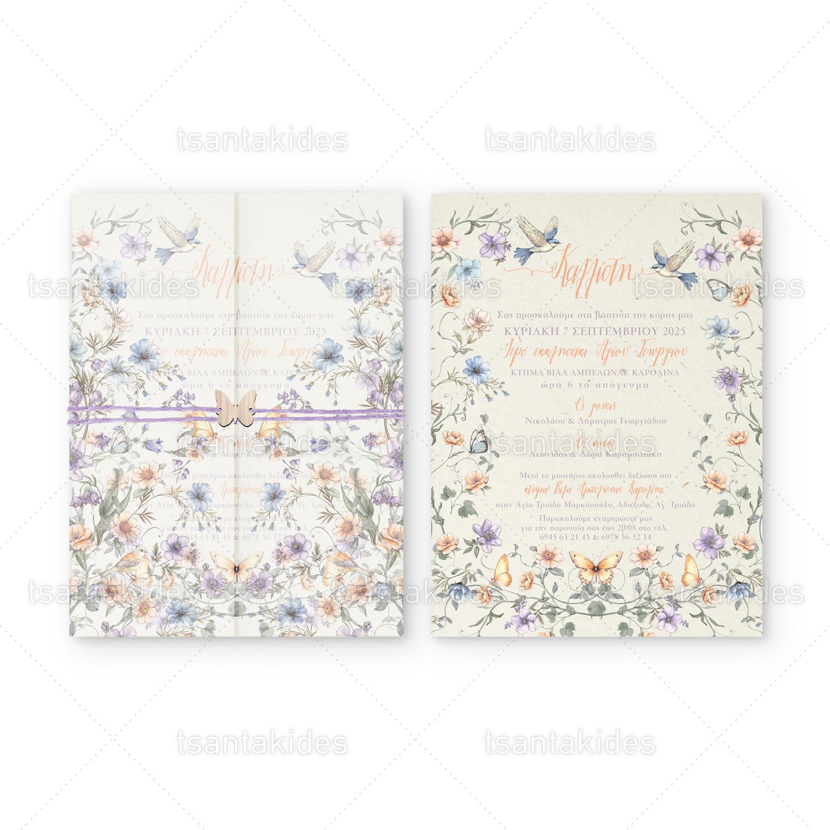 Προσκλητήριο βάπτισης για κορίτσι με θέμα Λουλούδια με πεταλούδες και πουλάκια.