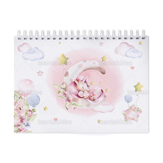 Παιδική μπομπονιέρα βάπτισης μπλοκ ζωγραφικής με διάσταση 21x29cm, εκτυπωμένο με θέμα Μονόκερος Στο Φεγγάρι.