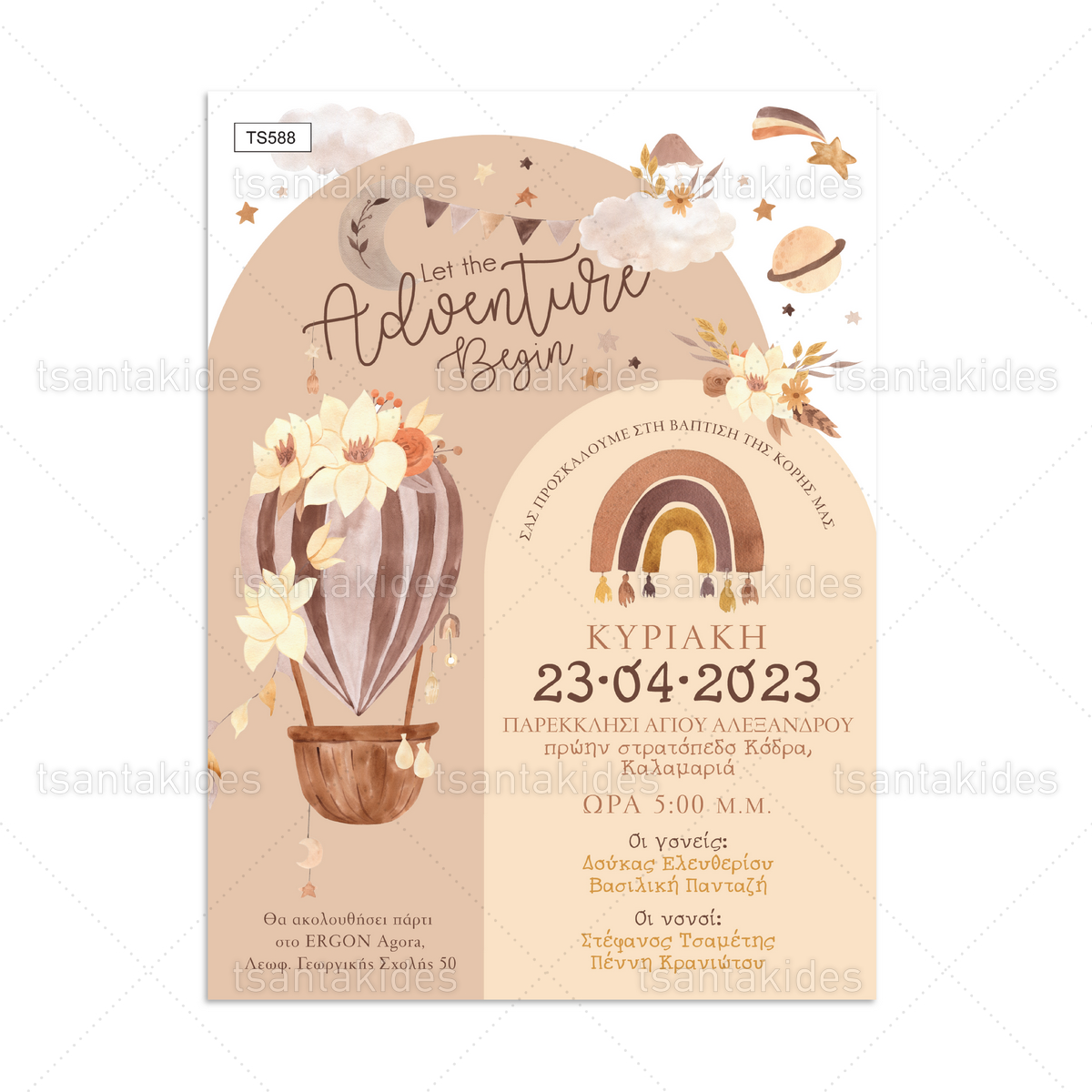 Προσκλητήριο βάπτισης για κορίτσι με θέμα Airballoon and Rainbow.