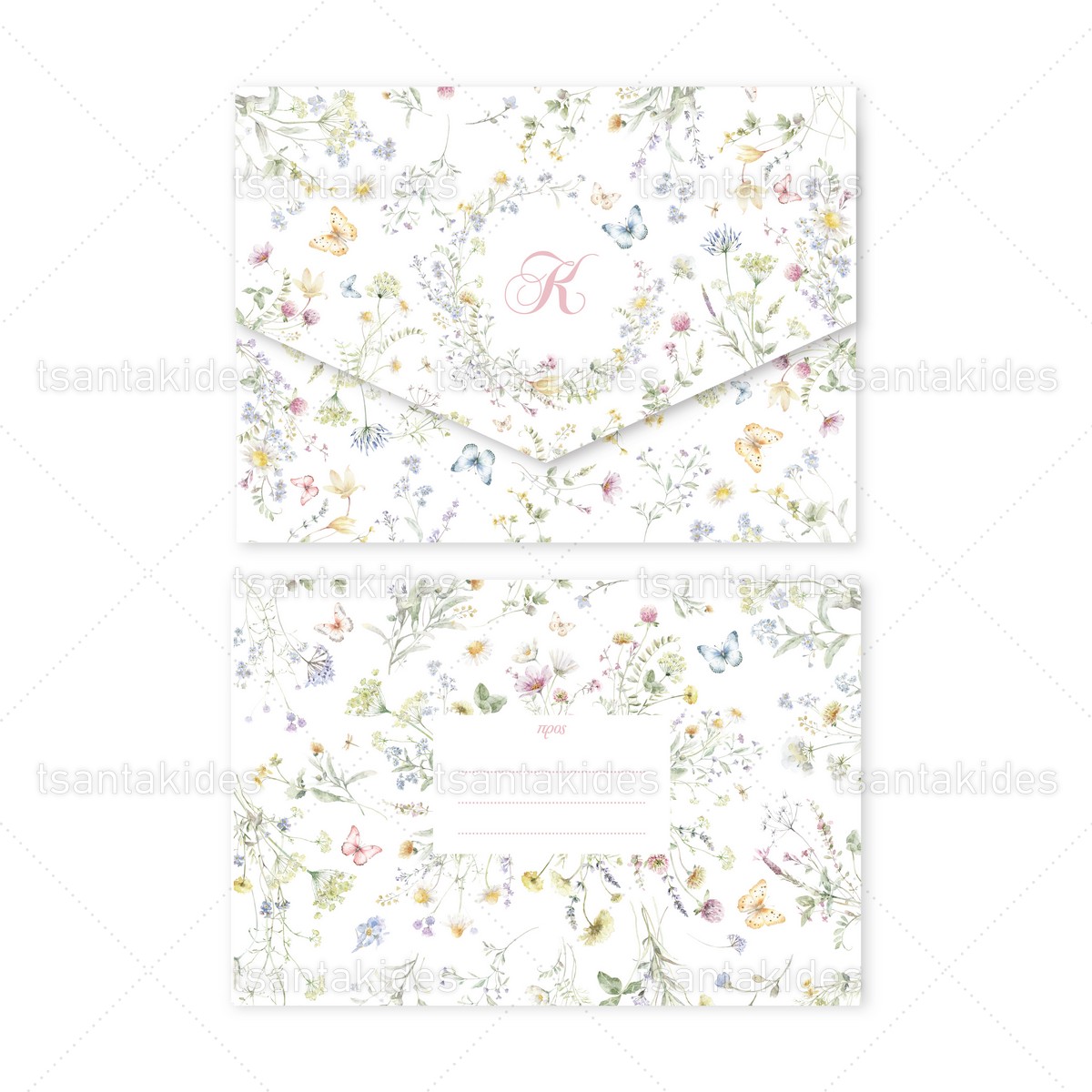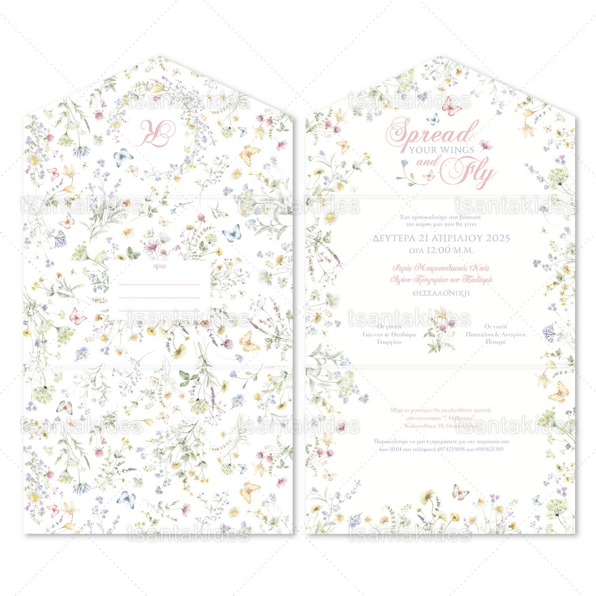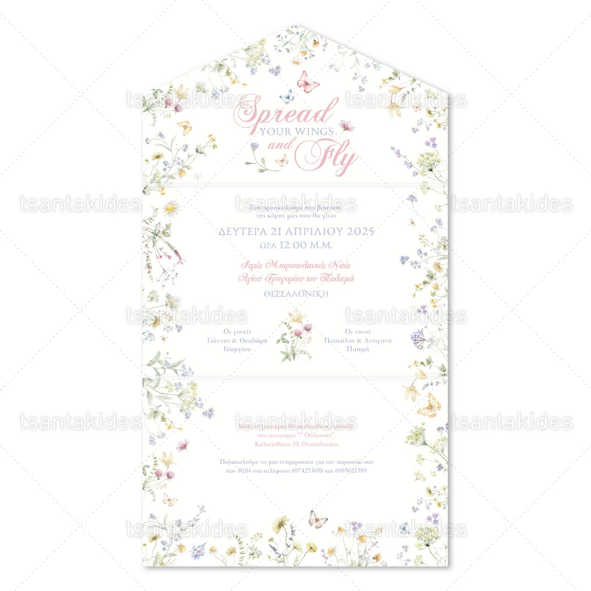 Προσκλητήριο βάπτισης για κορίτσι με θέμα Πεταλούδες και Λουλούδια.