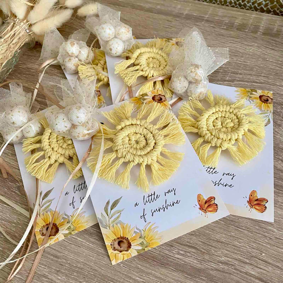 Μπομπονιέρα βάπτισης macrame ήλιος μαγνητάκι πάνω σε θεματικό καρτελάκι. Ιδανική επιλογή και για κέρασμα γέννας ή αναμνηστικό δωράκι σε baby shower party.